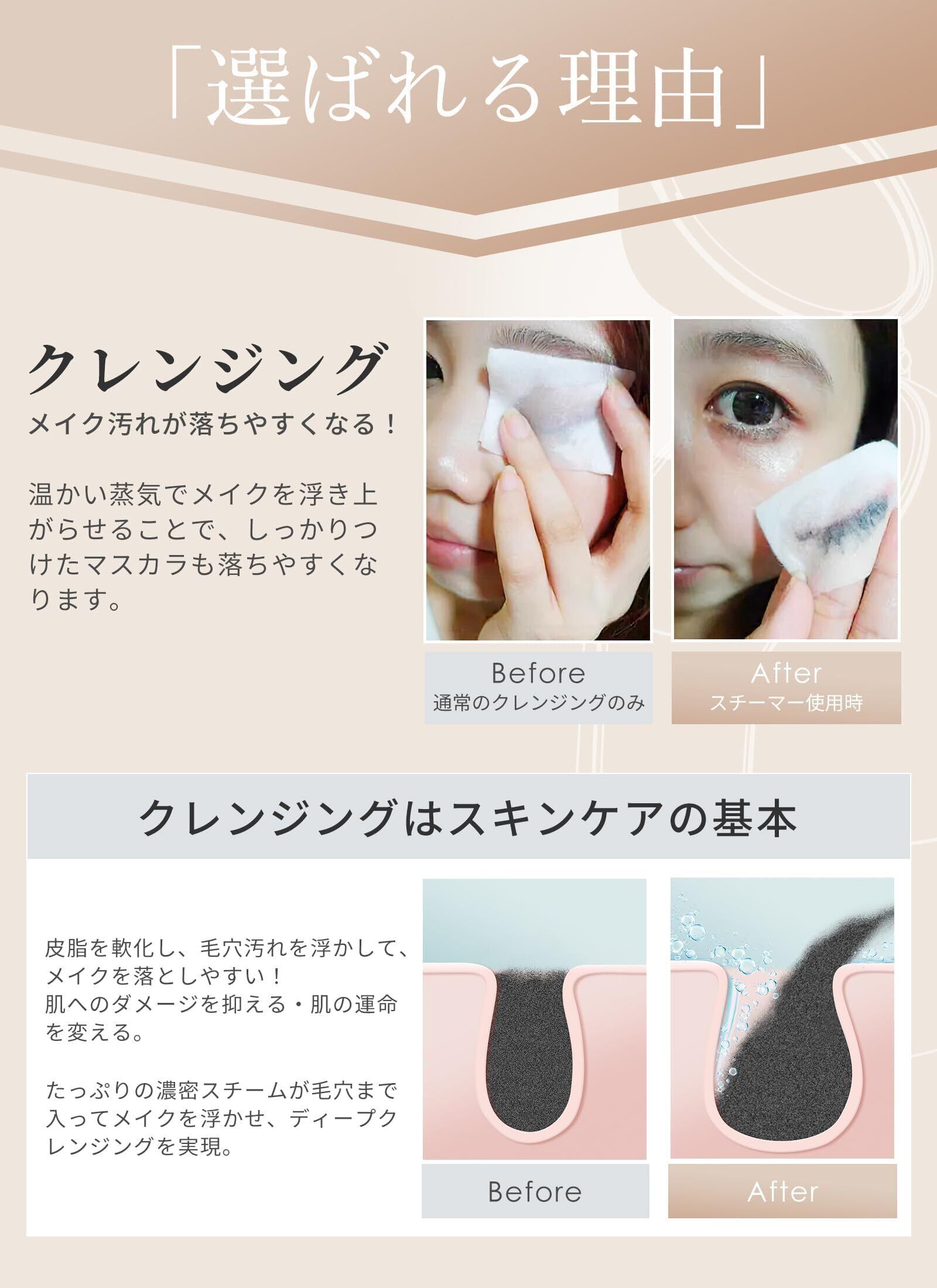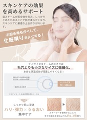 【微粒化技術/ワイド濃密スチーム】ナノは1mmの10億分の1の細かい粒子。普通のスチームと比べて格段にキメが細かいので肌への浸透力も高い!瞬時にナノ化された水分子がお肌の奥にまで届く、毛穴を開くことで詰まった角栓や汚れを落とし、洗浄効果を高め基礎化粧品の浸透率をアップさせてくれる美顔スチーマーです。
