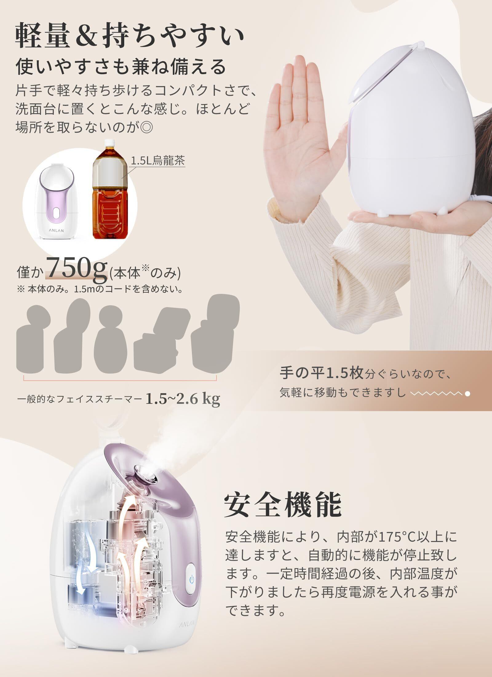 ANLANのフェイススチーマーは、濃密なナノミストを生成することで、まるでエステサロンにいるような贅沢なスキンケアを実現します。自宅で簡単に使えるため、お忙しい方にもぴったりなアイテムです。あなたの美しさを引き出すお手伝いをします!