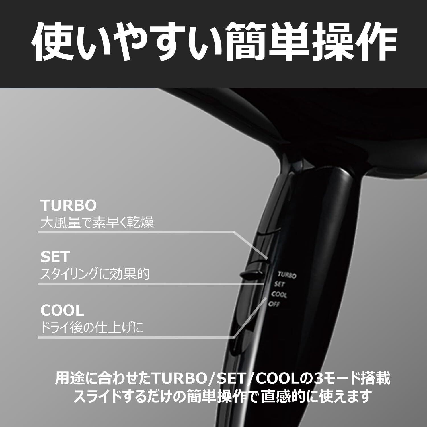 ・電源:AC100V 50/60Hz ・消費電力:1200・600W切換え式 ・マイナスイオン:○ ・遠赤セラミックコーティング:○ ・毛髪巻込み防止機構:○ ・メインスイッチ:TURBO-SET-COOL-OFF ・コードの長さ:約1.7m