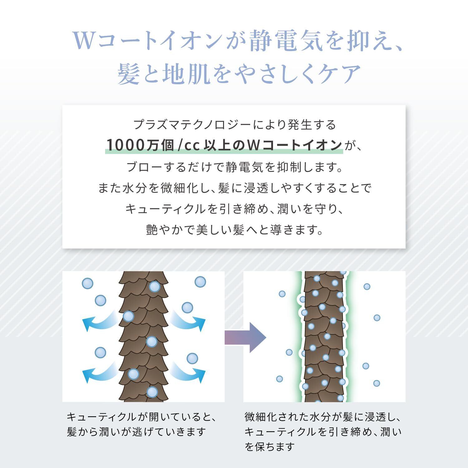 プラズマケア:1000万個/cc以上のWコートイオンが髪の潤いを守り、静電気を抑制します。