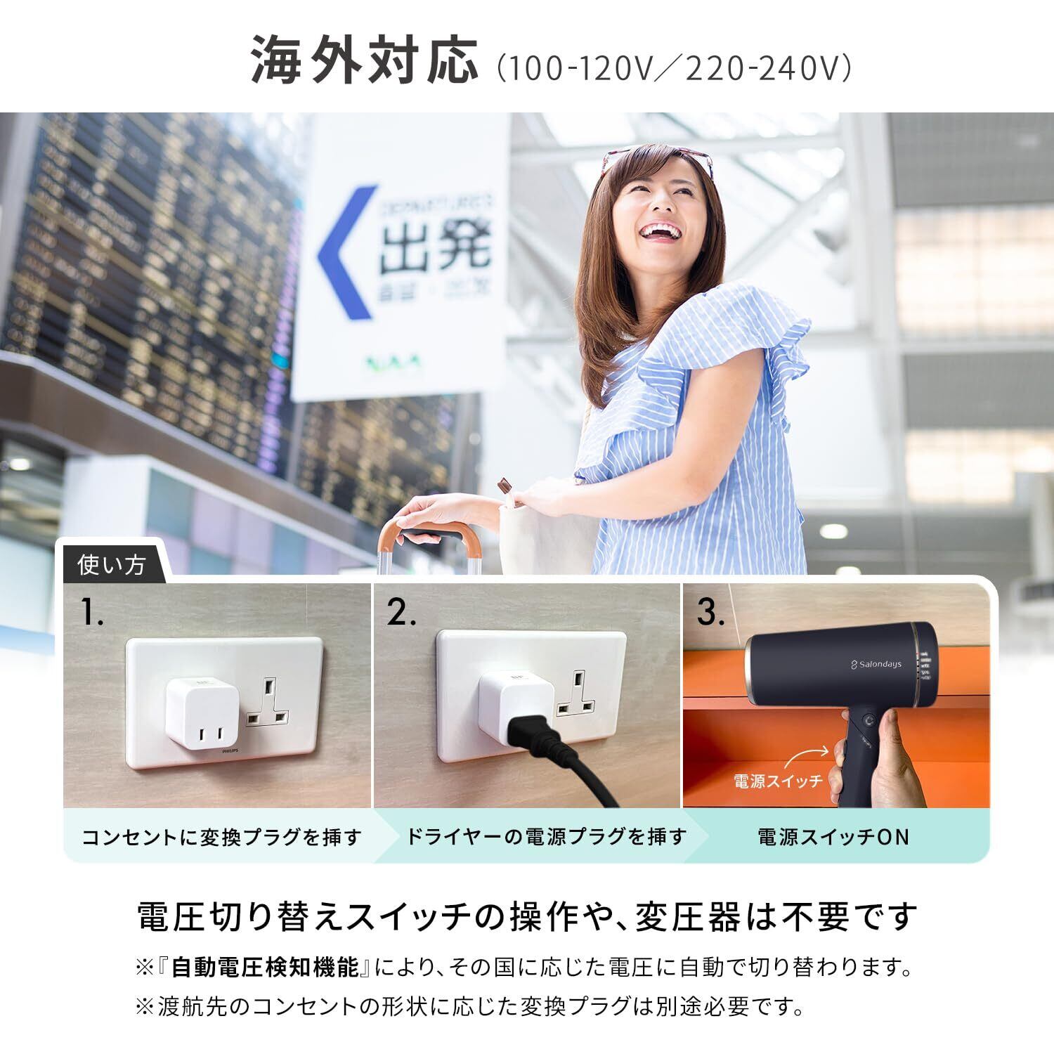 軽量設計で、持ち運びに便利なサイズ。旅行や出張にも最適で、海外でも対応可能な電圧仕様です。コンパクトなデザインながらも、しっかりとした大風量を実現しているので、どこでも美しい髪を手に入れられます。