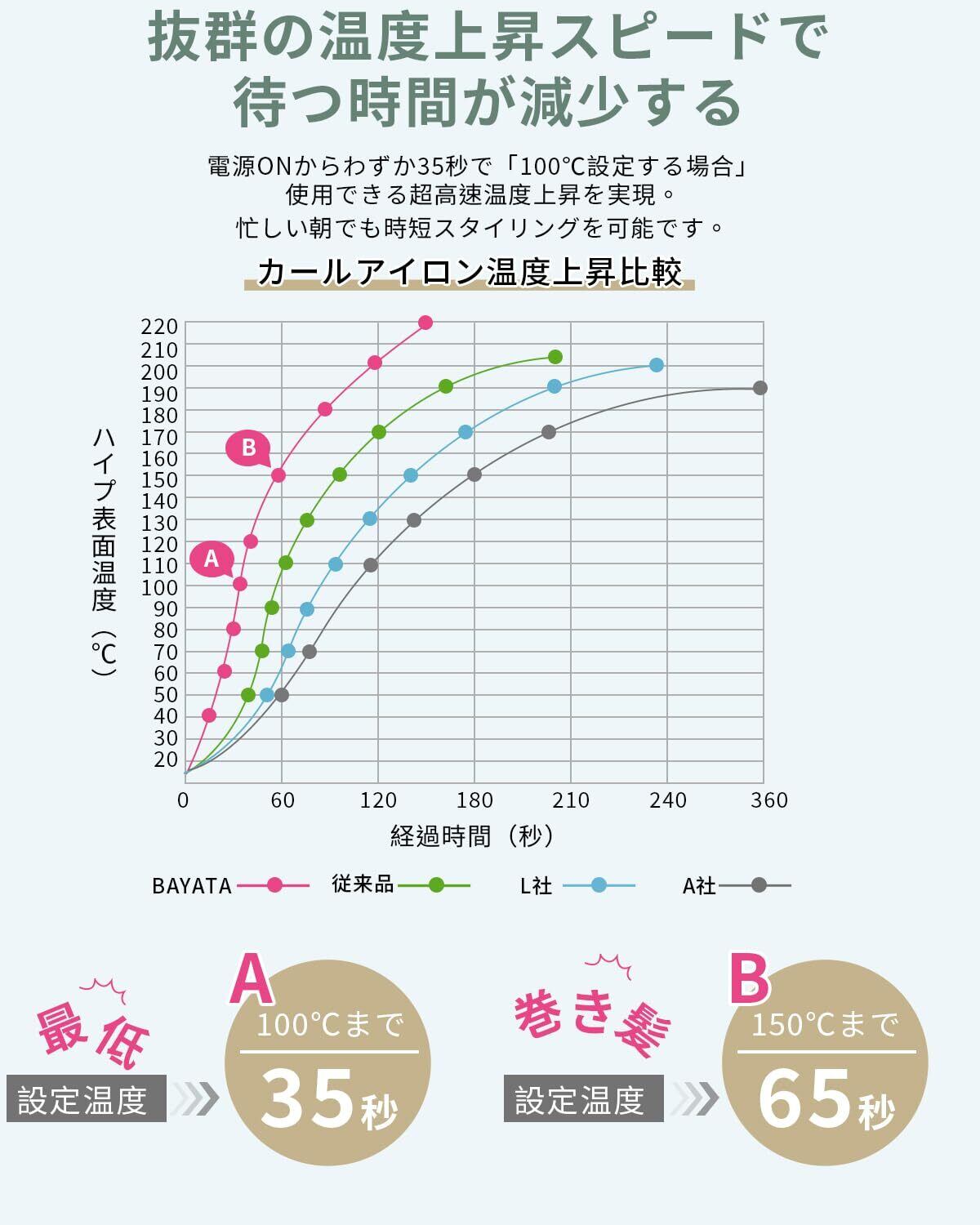 BAYATAのヘアアイロンは、32mmの太めのバレルを採用しており、ふんわりした大きめの巻き髪を簡単に実現します。25段階の温度調整機能によって、髪質やスタイルに合わせた理想的な温度が選べ、最大220℃まで設定可能。手軽にプロの仕上がりを楽しむことができます!