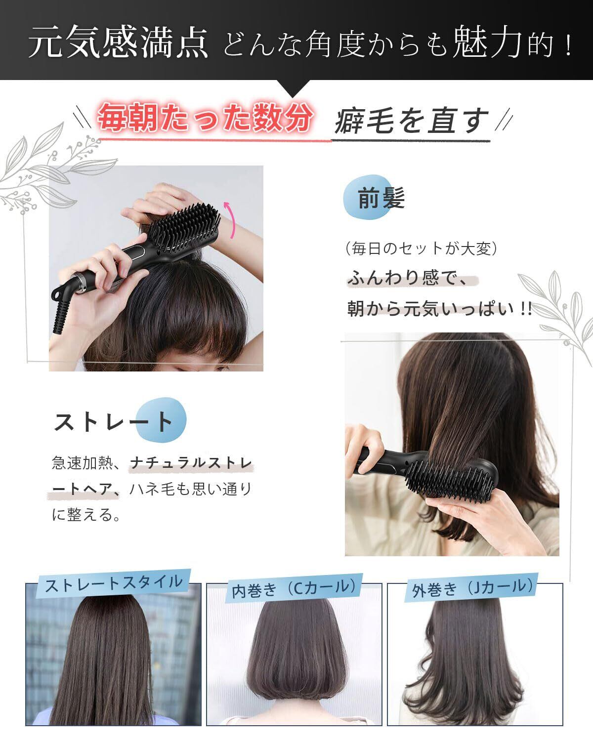 【海外対応・簡単な操作・不慣れな方に適用】ブラシアイロンは100V-240V対応で、海外でも使用可能、軽量で持ち運びもラクラク!世界中どこへでも気軽に持ち出せるので、旅行や出張先でも美しいヘアスタイリングを楽しめます。ヘアブラシのような形で、梳かしながらクセを伸ばせる点が魅力のヘアアイロンブラシ。テクニックがいらないため、ストレートアイロン・カールアイロンをうまく使いこなせず悩んでいる人や、より手軽にストレートにしたい方、ヘアスタイリングを長時間キープしたい方、またすばやく整えたい方にはぴったりです。ヘアアイロン初心者の方は是非た試してみてください。毎日のスタイリングがラクに、そして楽しくなること間違いなし