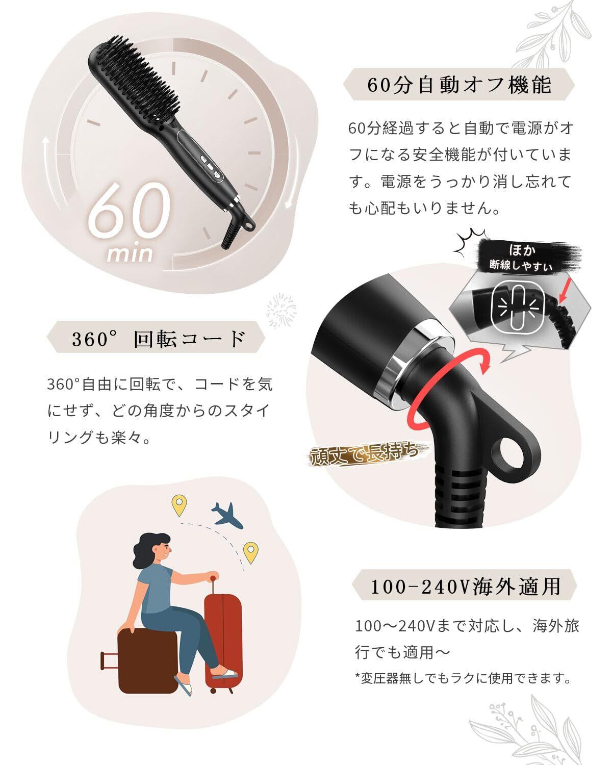 3000万マイナスイオンが静電気を防ぎ、パサつきや広がりを抑え、しっとりとしたツヤ髪を実感することができます。また、電熱ブラシは火傷防止設計が施されているため、安心してご使用いただけます。さらに、60分自動オフ機能付きで、安全にも配慮されています!