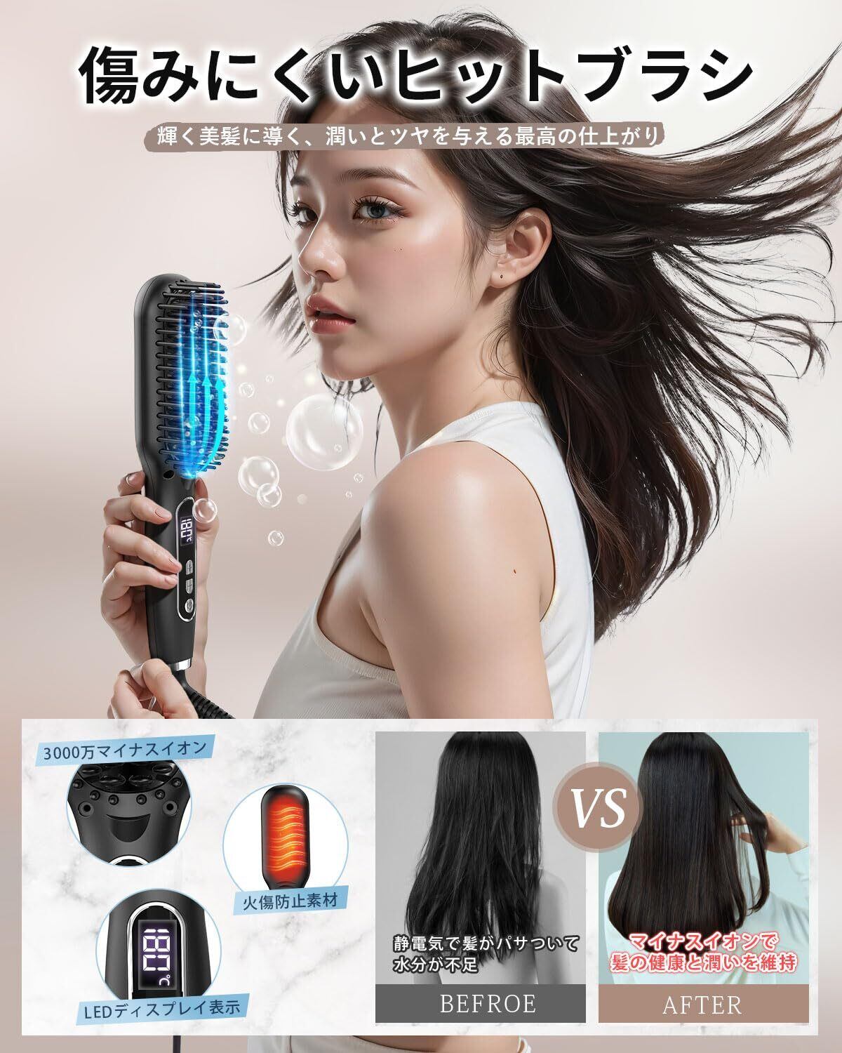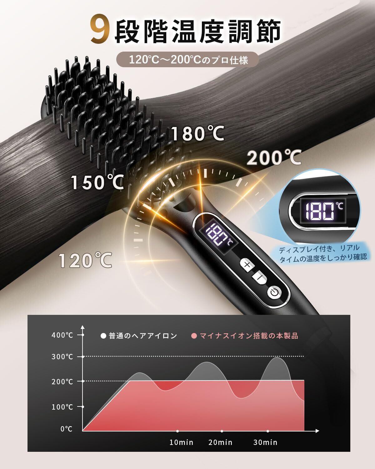 Aliliy ストレートブラシ ヘアアイロン ヒートブラシロン 【3000万マイナスイオン/120~200℃ 9段階温度調整 /潤いとつやのある髪 ヘアケア ブラシアイロン 60分自動オフ LED】 ヘアアイロン 軽量 コンパクト 持ち運び便利 電熱ヘアブラシ 火傷防止 海外対応 ストレートブラシ (ブラック)