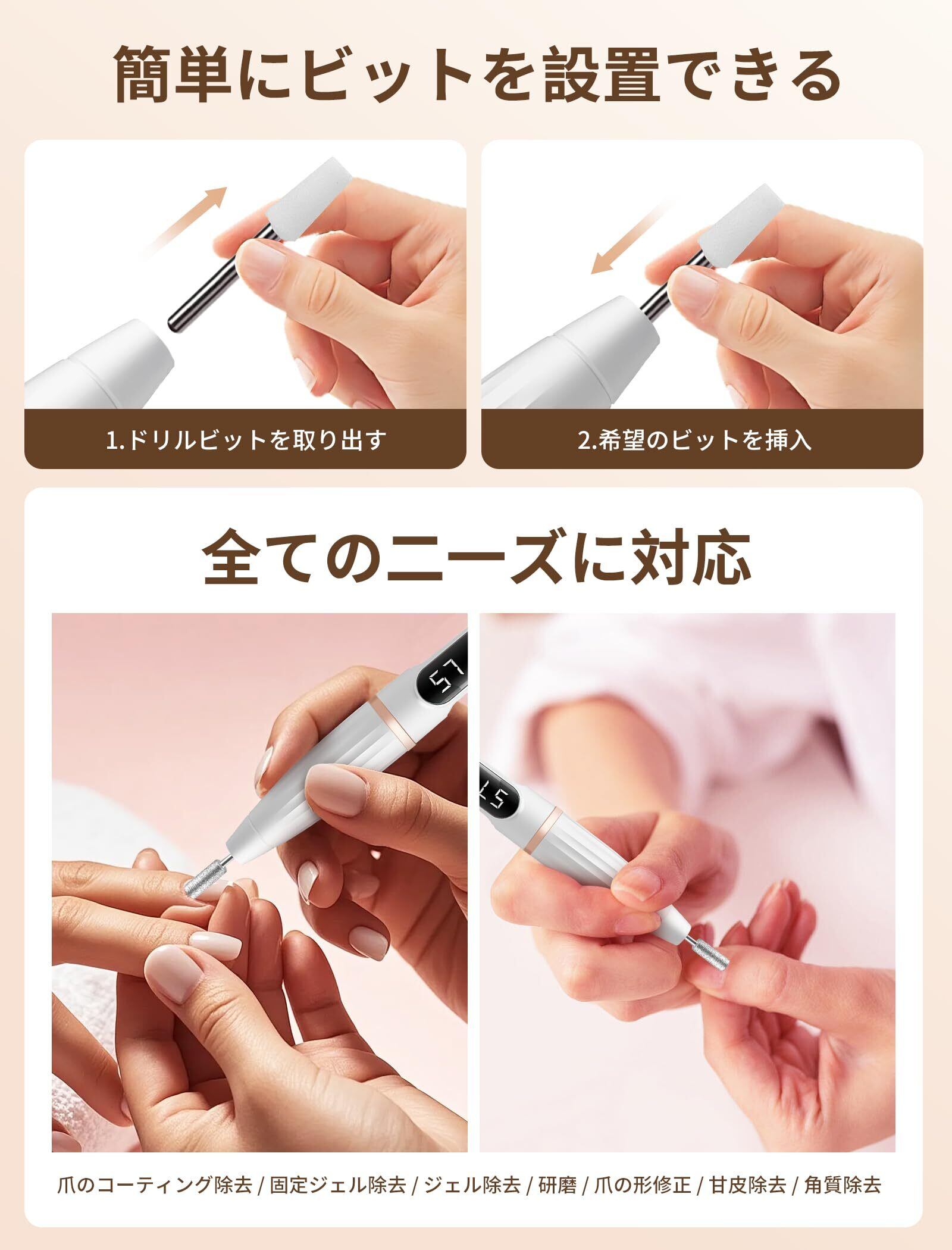 本製品には、ドリル10個が付属しており、さまざまなネイルケアに対応。これにより、自爪の下処理から、甘皮処理、ネイルアートまで幅広く使用でき、様々なニーズにお応えします。