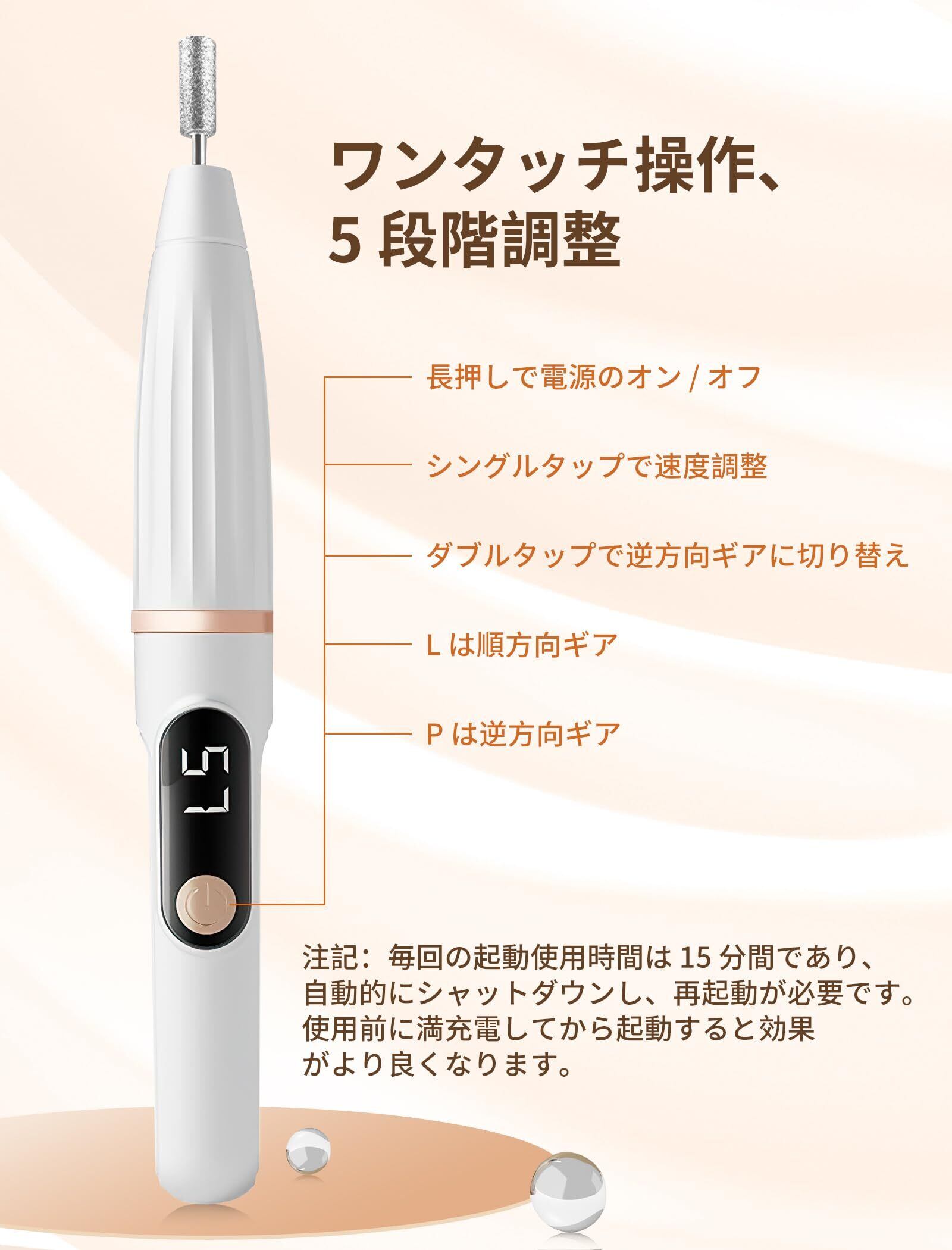 最大回転数25000rpmを誇る本製品は、5段階のスピード調整機能を搭載。自爪やジェルの種類に応じて最適なスピードを選択できるため、削りすぎる心配がなく、安全で効率的にネイルケアを楽しめます。