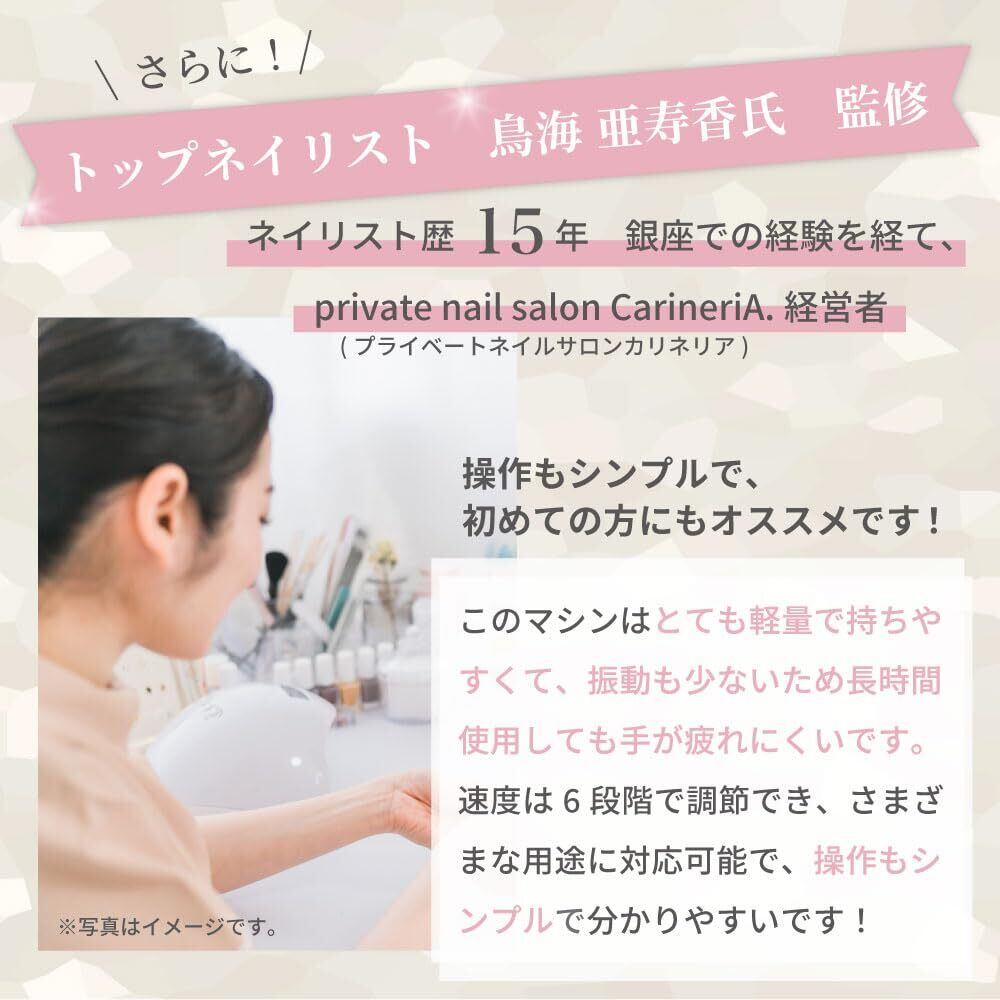 トップネイリスト 鳥海亜寿香氏 監修 ネイリスト歴15年 銀座での経験を経て、private nail salon CarineriA.経営 (プライベートネイルサロンカリネリア) 操作もシンプルで初めての方にもおすすめです! このマシンはとても軽量で持ちやすく、振動も少ないため長時間使用しても手が疲れにくいです。 速度は6段階で調節でき、さまざまな用途に対応可能で、操作もシンプルで分かりやすいです!