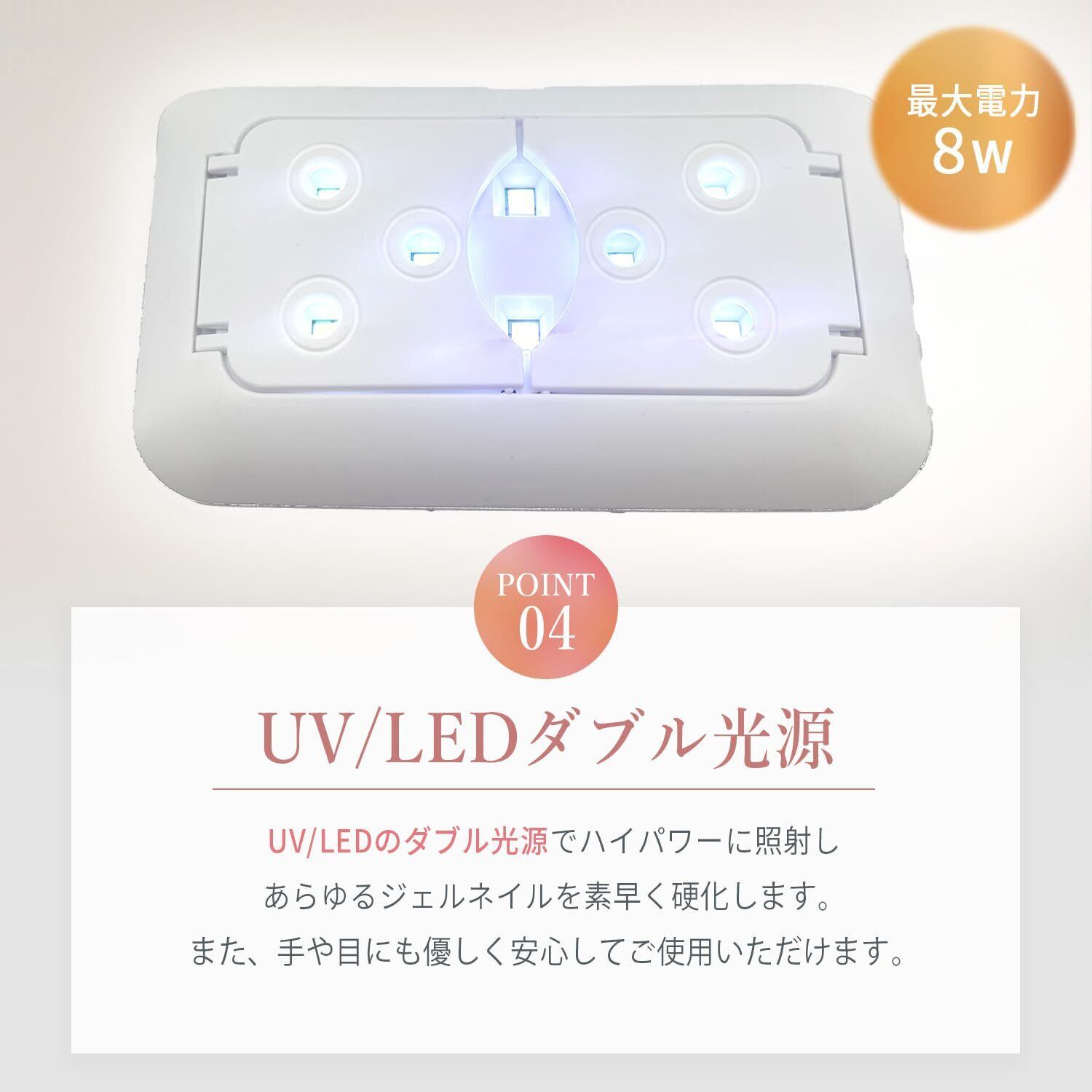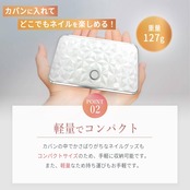 「煩わしい電源は不要!コードレス充電式だから、外出先や旅行先でも電源を気にせず快適に使えます。 わずか127gの軽量コンパクト設計で、バッグやポーチにもすっきり収まり持ち運びに最適。 手持ちでも置き型でも使える2WAY仕様で、シーンに合わせて自由にスタイリングできます。 UV+LEDのハイブリッド光源でジェルネイルからハードジェルまで幅広く対応。 60秒/120秒のタイマー機能も搭載し、効率的に仕上げられます。 自宅でのセルフネイルはもちろん、旅行や出張、友人との集まりなど幅広いシーンで大活躍!」