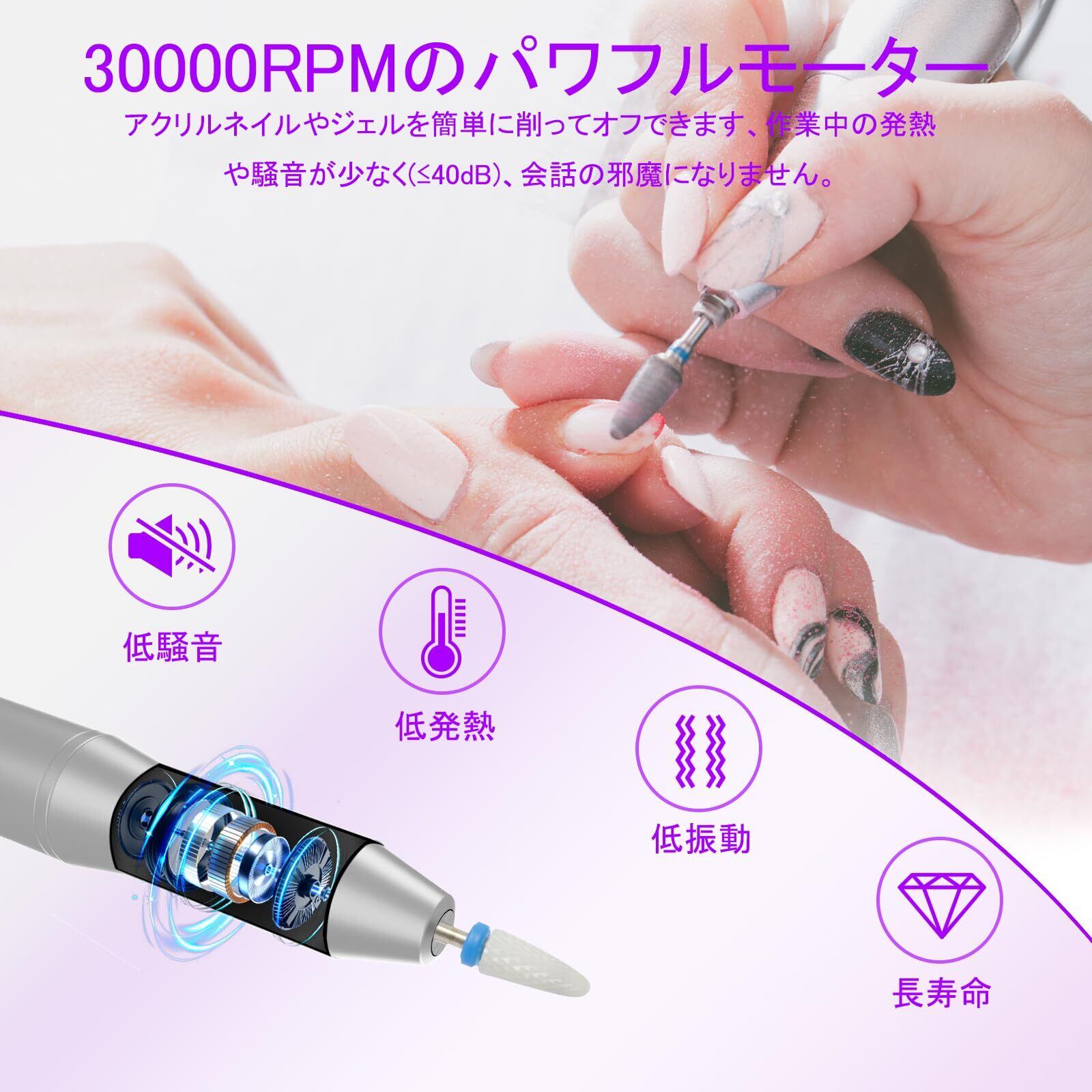 【低振動・低騒音・低発熱】本ネイルマシンは、最新の強力で静音性に優れたモーターと精密設計のベアリングを採用しており、最大回転数は30,000rpm、力強く安定した出力で、振動を抑え、騒音(≤40dB)も低く、熱も発生しにくいため、快適かつ効率的なネイルケアを実現します