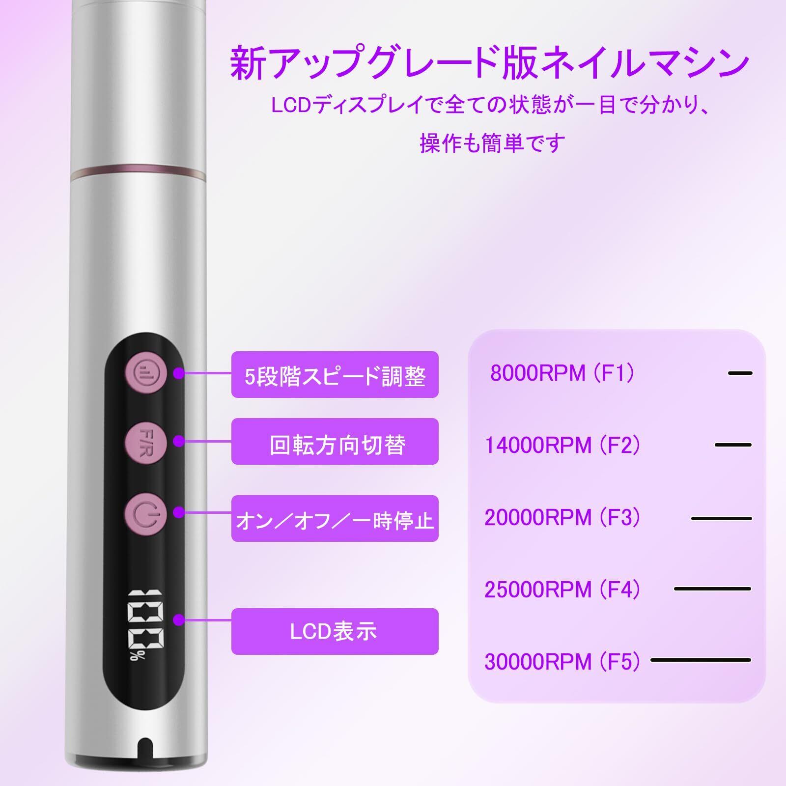 【LCDディスプレイ&5段階スピード調整】ネイルマシーンにはLCDディスプレイが搭載されており、作動状況、回転速度、回転方向、バッテリー残量を一目で確認できます。速度は8,000~30,000rpmの5段階で調整可能。さらに、一時停止機能やF/R(正転/逆転)切替機能も備えており、右利き・左利きどちらの方にも快適にお使いいただけます。プロのネイリストから初心者まで幅広く対応する設計です