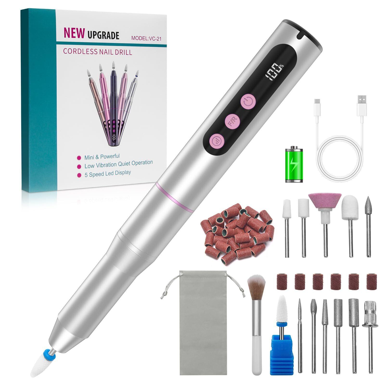 \【在庫処分】CGBE ネイルマシン: 電動ネイルオフマシーン コードレス ジェルネイル オフ ネイルケア 12個セット 爪磨き 甘皮処理 角質除去 ネイルドリル 正逆回転 30000RPM 高速回転 5段階調整 USB充電 自宅サロン用 (シルバー)/