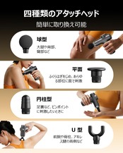 本製品には、さまざまな部位に対応するための4種類のアタッチメントが付属しています。肩や首には球形アタッチメント、腰や太ももには平形アタッチメント、ピンポイントで刺激が欲しいときには円柱形、挟み込んで使いたい場合にはU字形がぴったりです。