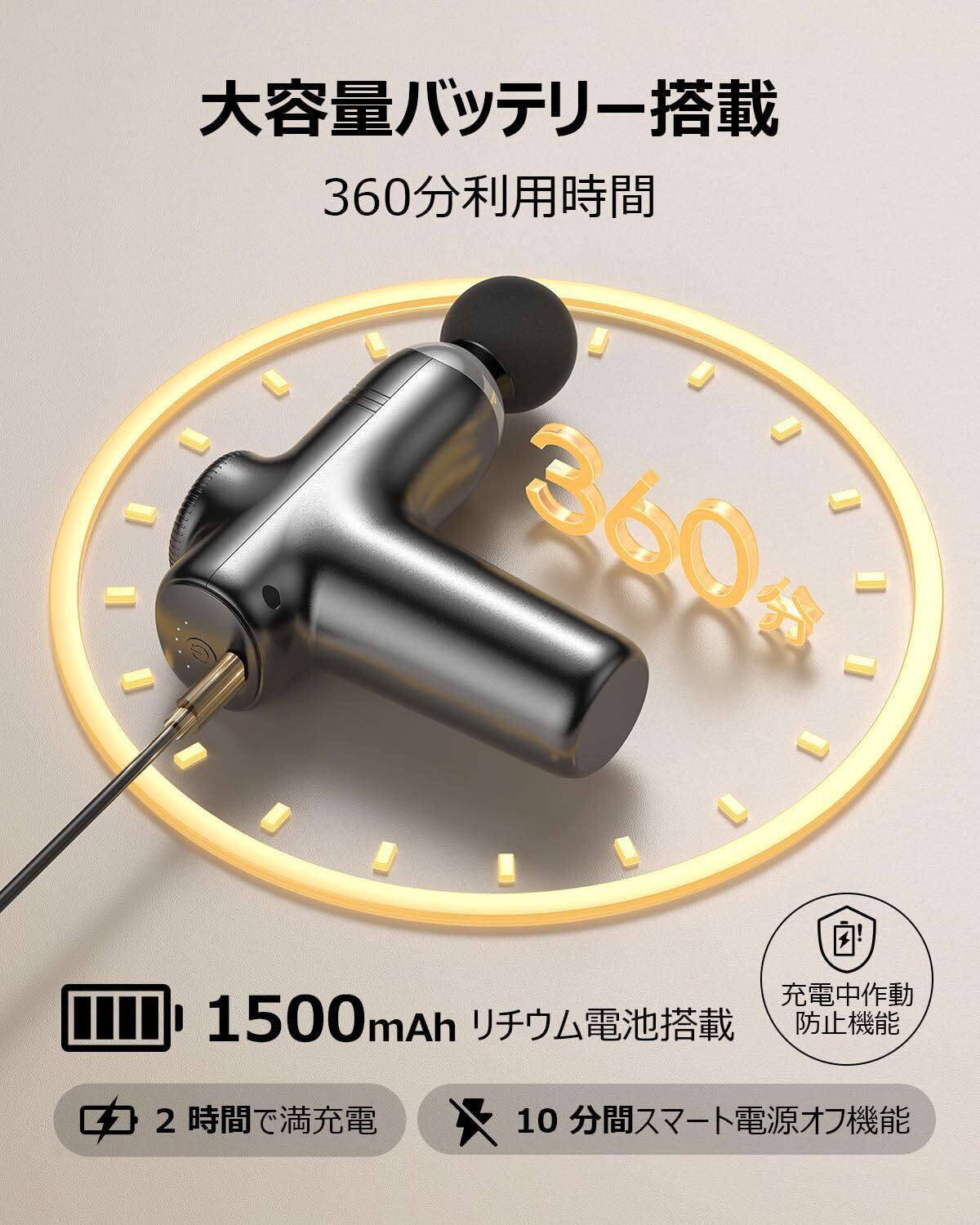 【Type-C 充電&持ち運び便利】このミニ筋膜ガンは1500mAh大容量リチウムイオンバッテリーを内蔵し、フル充電で約6時間連続使用可能(電池残量や使用環境により異なります)。Type-C 急速充電に対応し、充電も簡単迅速です。わずか445gの超軽量でコンパクトな設計なので、片手でも楽々とリラックスが可能です。自宅はもちろん、職場やジム、旅行先、公園、仕事や家事の合間など、どこでも、いつでも、誰でも手軽に使用できます。この1台で十分です!(充電中は使用しないでください)。