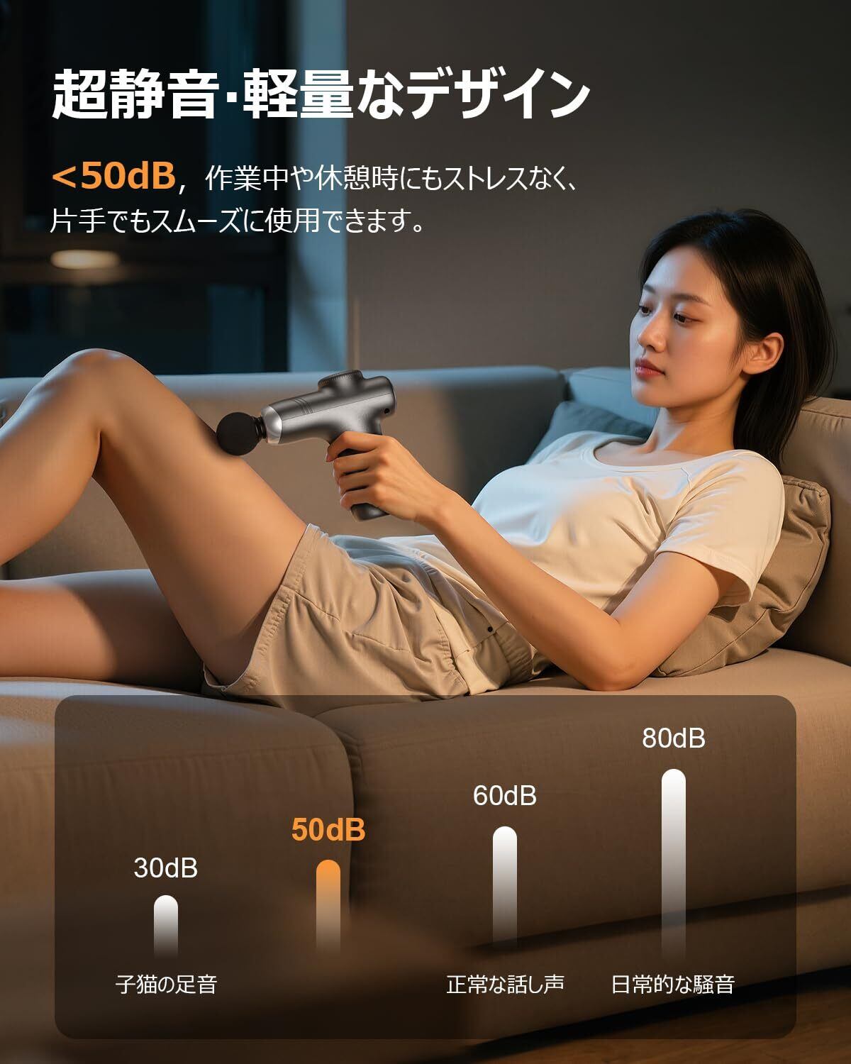 【超低騒音デザイン&高性能チップ搭載】この強力筋膜リリースガンは安心の静音設計を採用し、最大4000回転/分での作動音も50dB未満と非常に低騒音で、効果的に騒音を抑え、静かな使用環境を提供します。早朝や深夜でも使用可能で、周囲の人に迷惑をかけることがありません。高性能なセキュリティチップも搭載し、過熱、過電流及び短絡(ショート)による危険を未然に防ぐ効果を発揮します。お客様の身体的安全を確保するため、並びに製品の耐久性を維持するため、本製品は 10 分間連続稼働するごとに自動的に電源を切るよう設定されています。セキュリティ面から身体の安全まで、万全の対策を講じています!