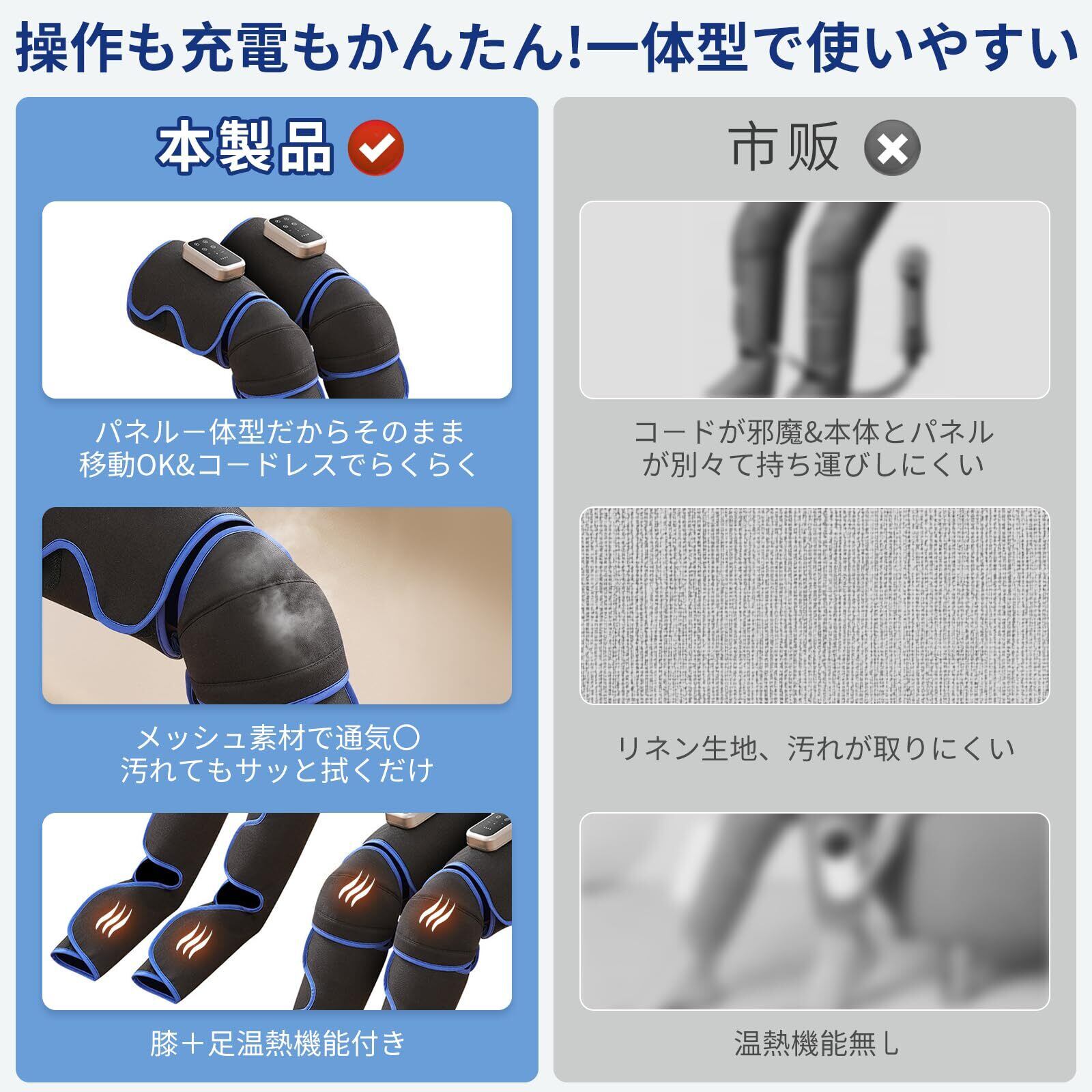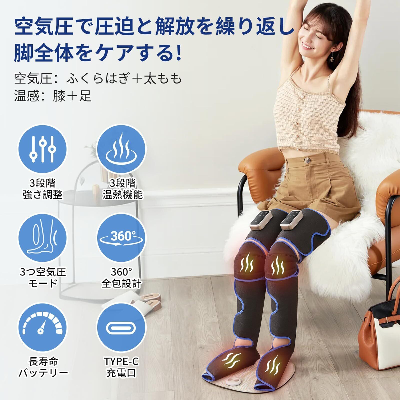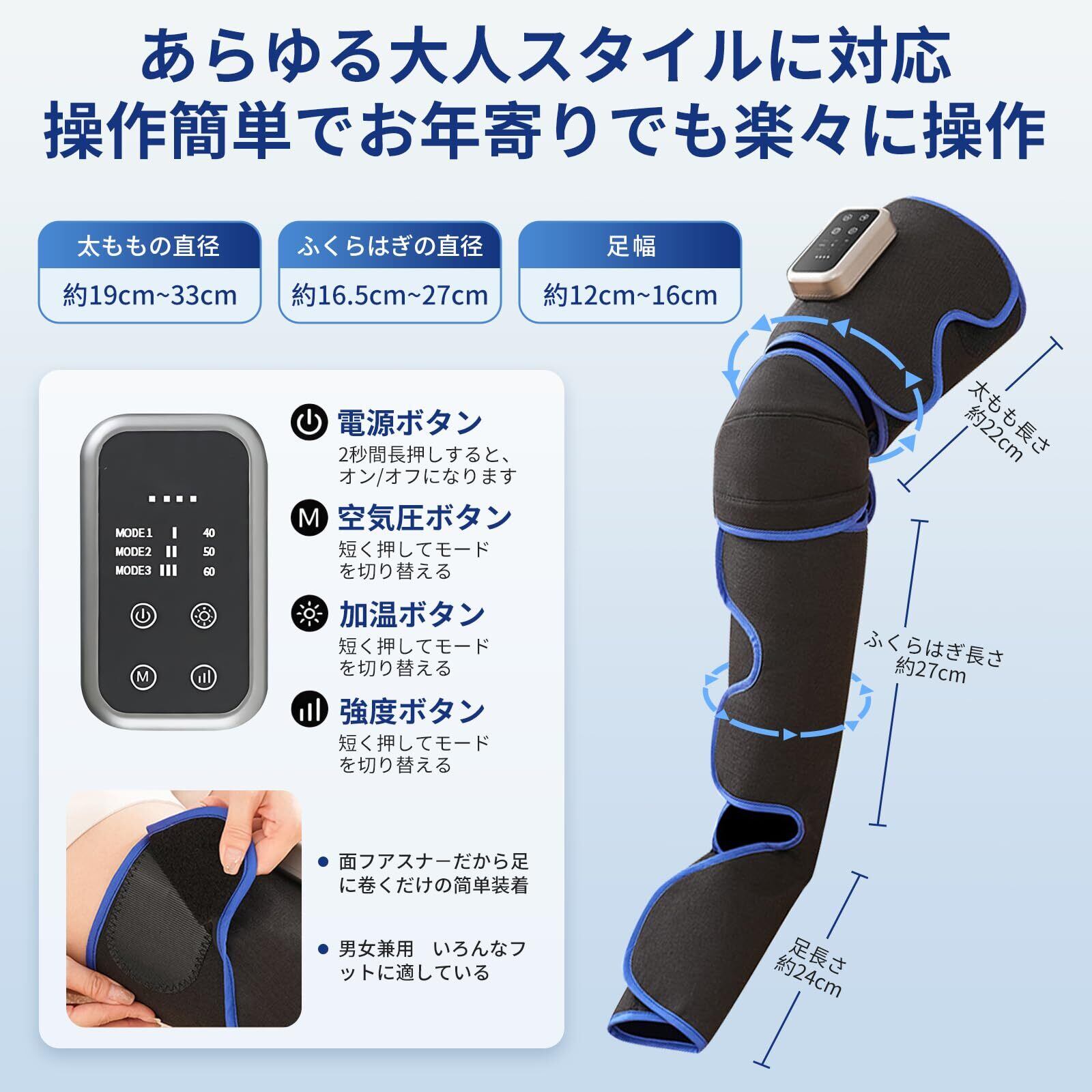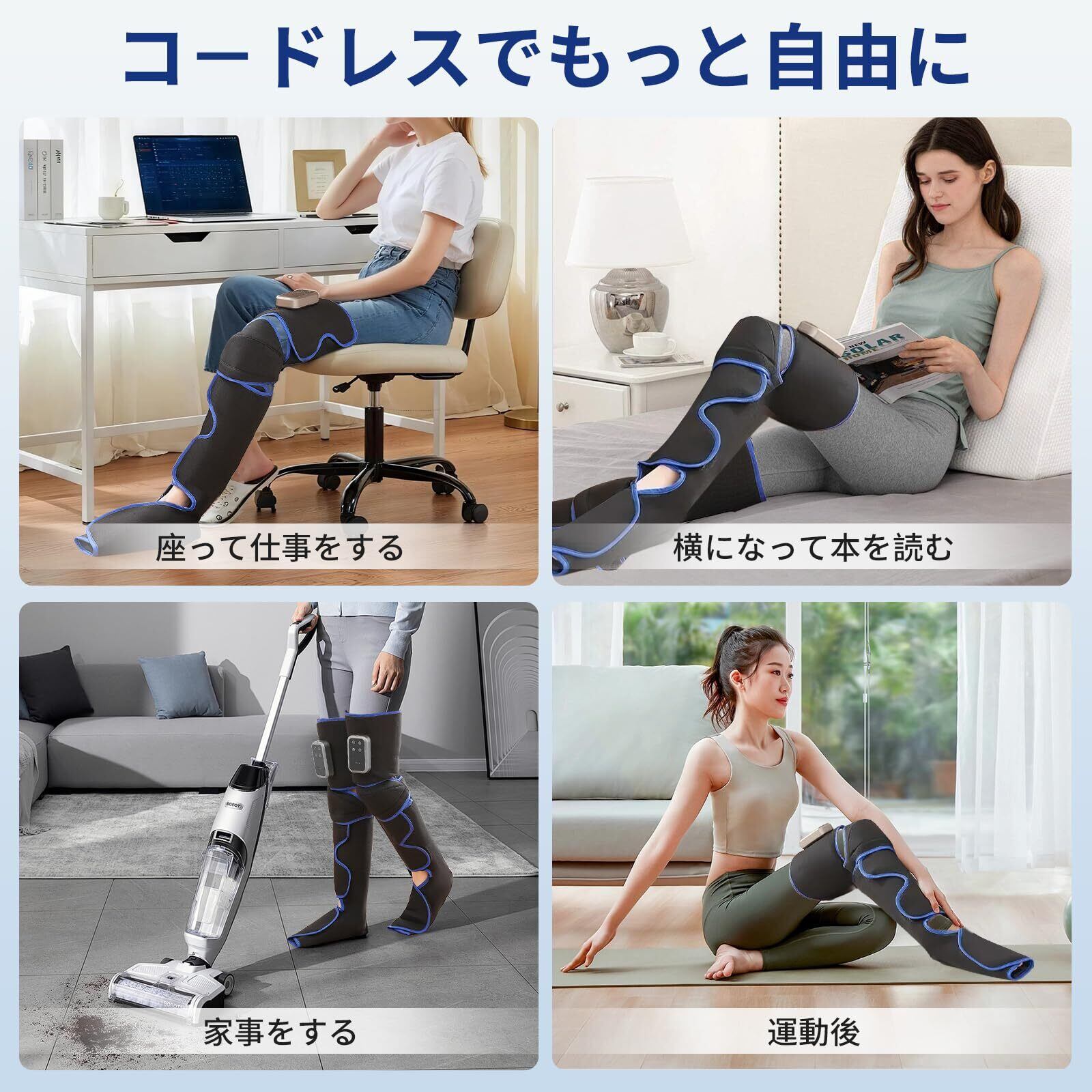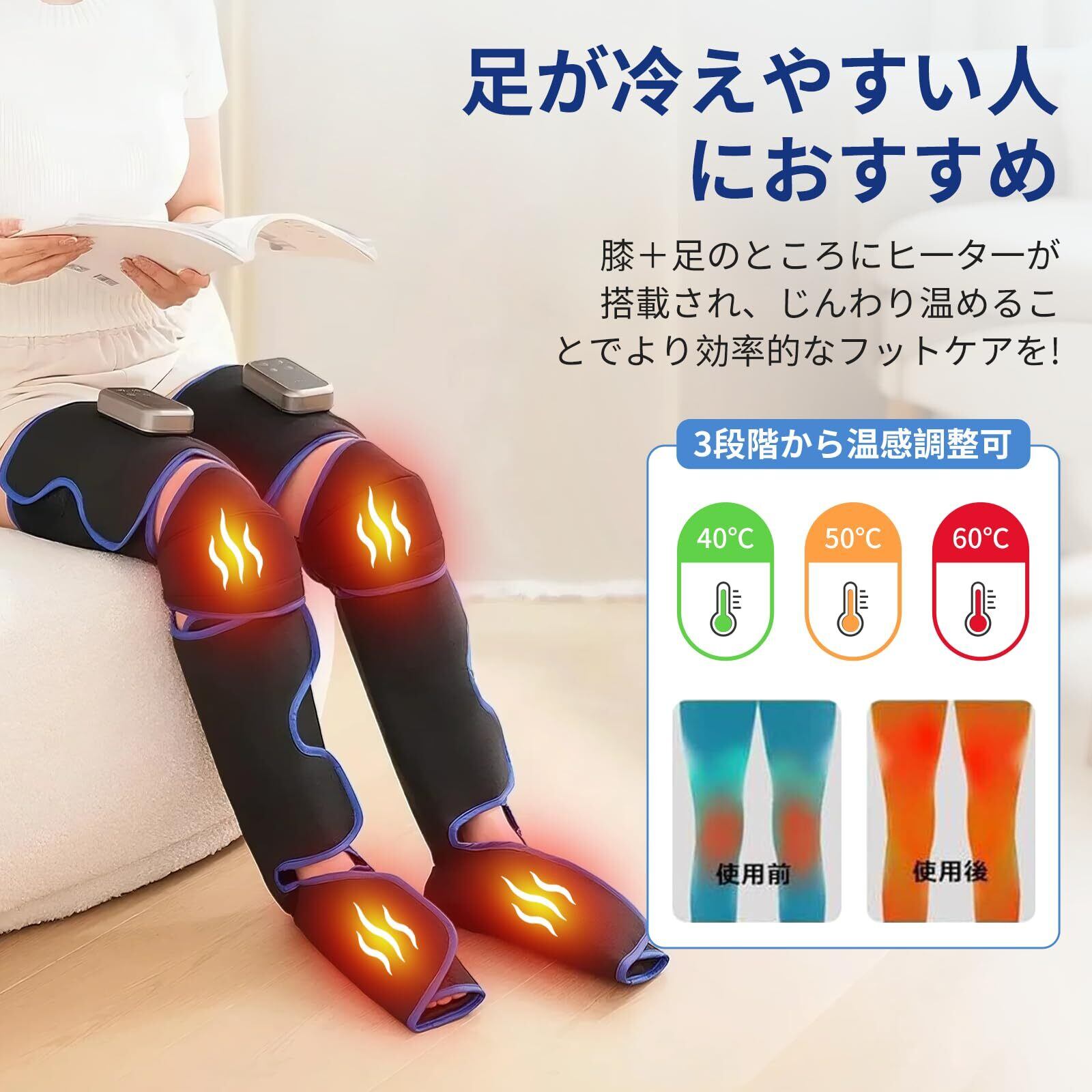 【真のコードレスで自由・USB充電式】他の有線式リモコンと比べて、真のワイヤレスを実現!ケーブルとコンセントの近くに縛【いつでも快適!温感機能】ふくらはぎケアの温度調整機能には、3段階の足と膝温度設定(低温40℃、中温50℃ 、高温60℃ )があり、その日の気分に合わせてお好みの温度を選べます。寒い季節でも心地よく温かく、快適にリフレッシュが可能です。夏の暑い時期には、温度をオフにすることもできます。歩くことが少ないと、気づかないうちに足が冷えやすくなります。在宅ワークなどによって歩くことが減っている人は、これをおすすめします。20分のオートオフタイマー内蔵で、使い過ぎや切り忘れを防止します。られず、どこでも自由にお使いいただけます。職場の椅子に座りながら、リビングでテレビを見ながら、ソファでくつろぎながらなど、他のことをしながらの使用に最適。立っている時、座っている時、横になっている時、さらには動き回る時でも外す必要がありません。家事をしながらやトイレに行く時でも装着可能なワイヤレス設計で、本当にストレスフリーな使い心地を実現しました。