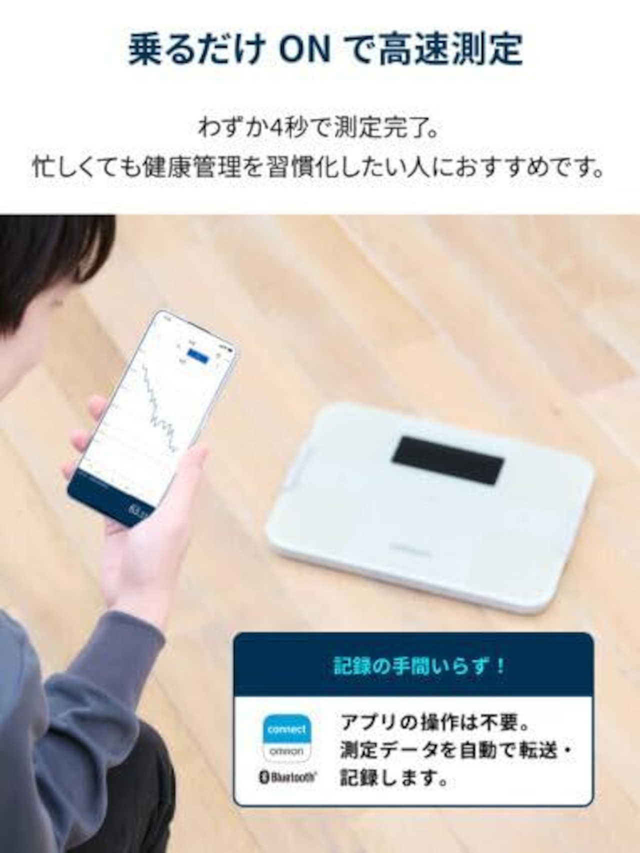 4秒高速測定/自動データ転送/表示項目カスタマイズ 時短・効率的でストレスフリーな体重管理