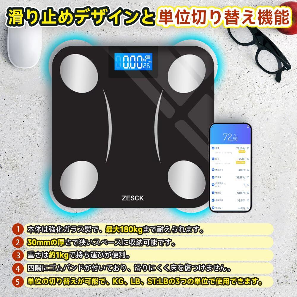 【新着商品】体重計 体脂肪計 体重計 スマホ連動 Bluetooth 体組成計 ヘルスメーター 対組成計 weight scale スケール 高精度 自動ON/OFF バックライト付 180kgまで対応 ボディスケール 強化ガラス コンパクト 軽量アプリ対応/体脂肪率/BMI/骨格筋率/基礎代謝量/水分量/体年齢/内臓脂肪レベル 日本語取扱説明書 日本語App USB充電式 ブラック