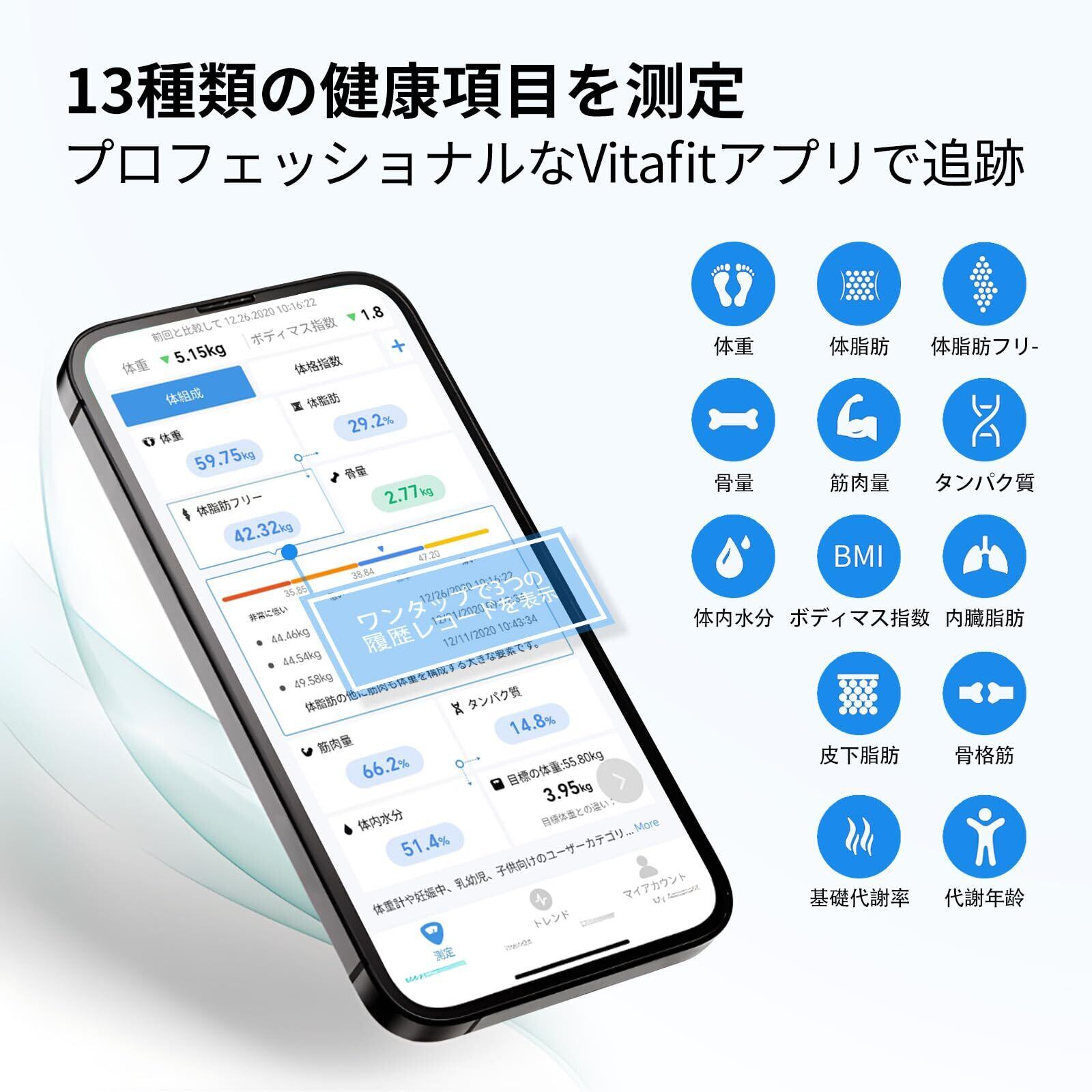 このVitafitの体脂肪計は、体重だけでなくBMI、体脂肪、筋肉を含む合計13種類の体組成を測定することができます。アプリと連携することで、簡単にデータを管理し、健康状態をリアルタイムで把握することが可能です。