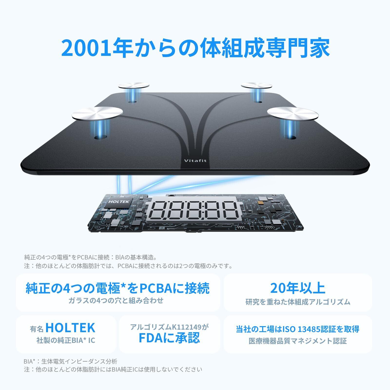 【体重計】Vitafit 体脂肪計・体組成計 、2001 年以来の計量専門工場、BMI、体脂肪、筋肉を含む 13 種類の体組成をアプリで同期、180kg x 0.05kg 精度(日本語対応APP&取扱説明書)、ブラック