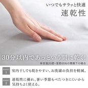 部屋干しでも素早く乾く速乾性に優れたこのボックスシーツは、特に湿気の多い季節や夏場のムレを防ぎます。ベタつきや蒸れを気にせず、快適な睡眠環境を提供します。さらに、ピーチスキン加工が施されており、心地よい手触りを実感できます。