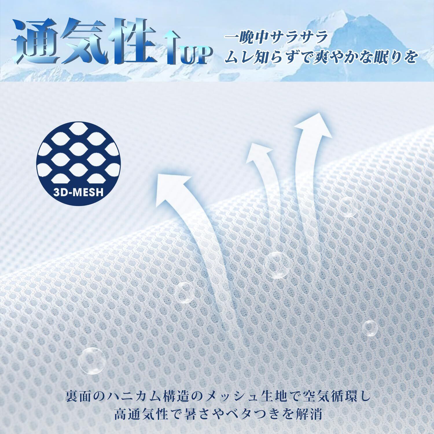 この枕パッドは、接触冷感素材と3Dメッシュ加工を採用しており、体温を逃がしながら優れた通気性を実現しています。蒸れにくく、さらっとした肌触りで、暑い季節でも快適に眠れます。