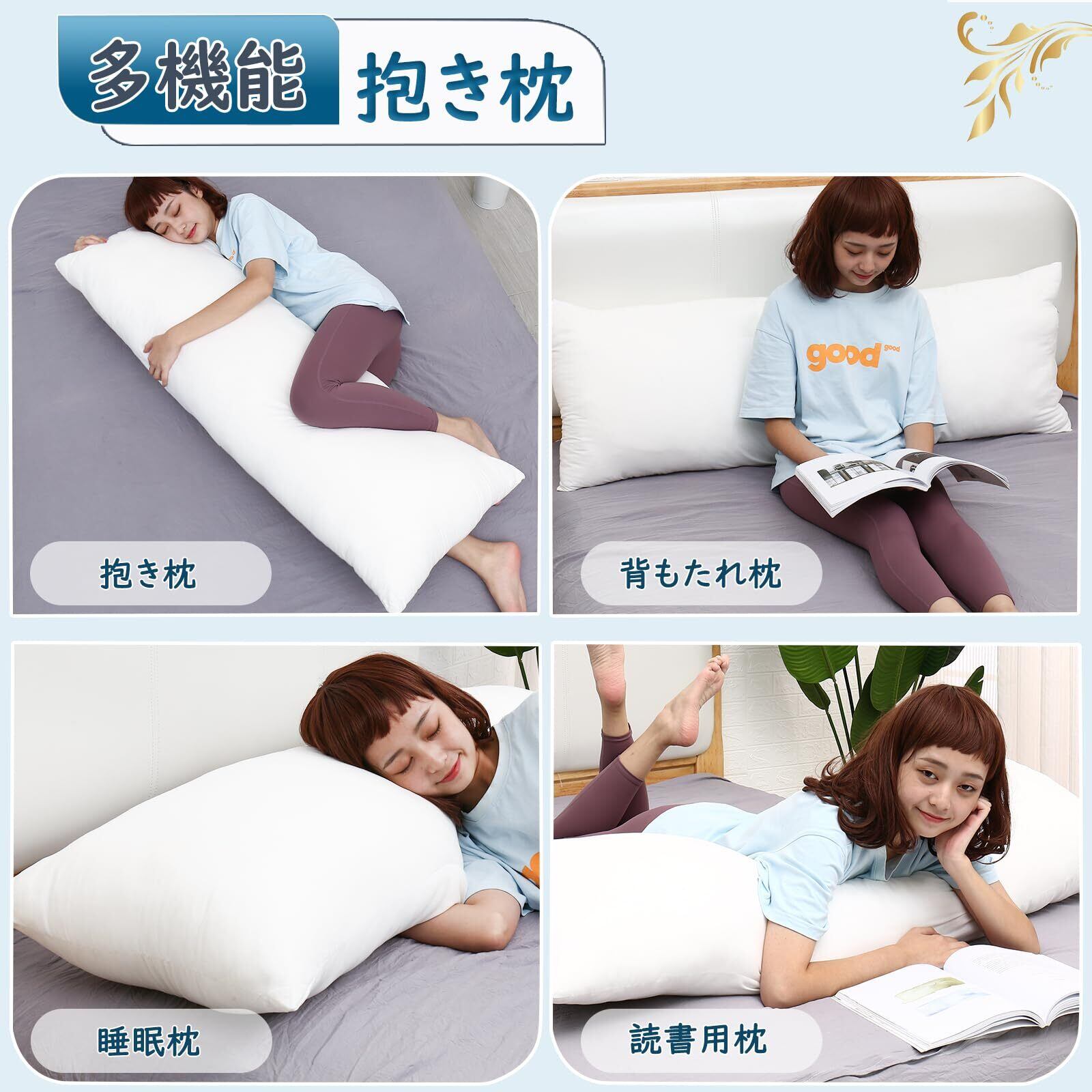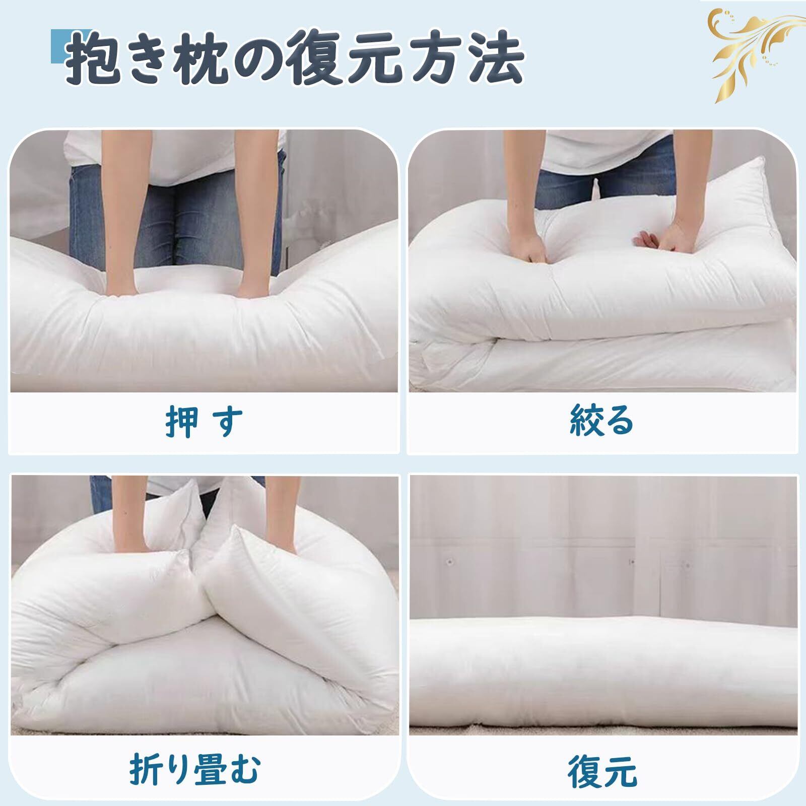 【ご注意】・本品は圧縮包装されておりますので、開封後は抱き枕を取り出し、24時間放置するか低温の乾燥機で乾燥させてください。完全に復元してからご使用いただけます。 ※圧縮によるシワはスチームアイロンで簡単に伸ばせます。 ・当製品は抱き枕の中身のみです。お好みのカバーを別途ご購入ください。