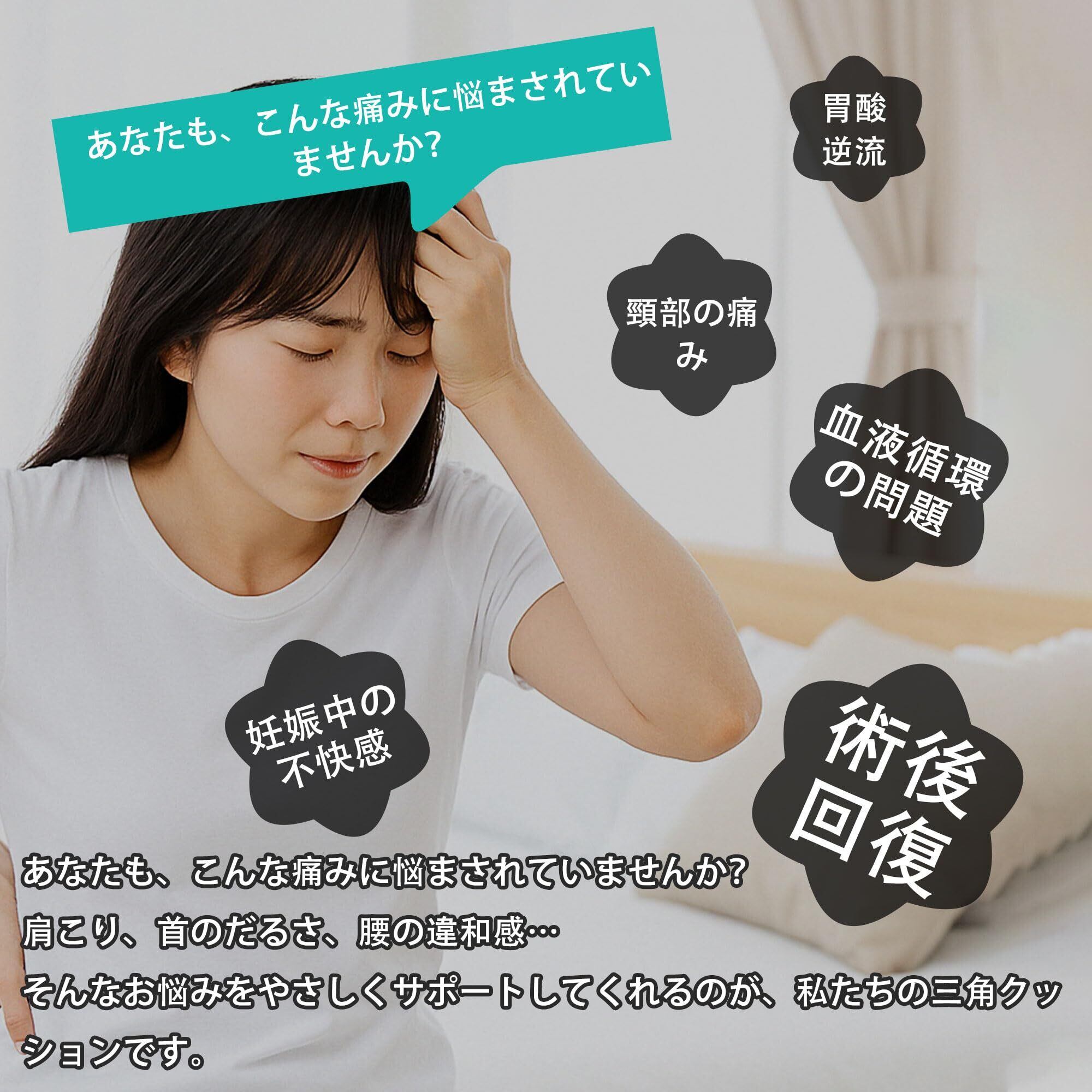 この三角枕は、背もたれとしても利用できるデザインで、テレビを観たり、本を読んだりする際に体を優しく支えます。特に、長時間同じ姿勢を取ることが多い方にもぴったり。頑張った体に寄り添い、素敵なくつろぎの時間を提供します。