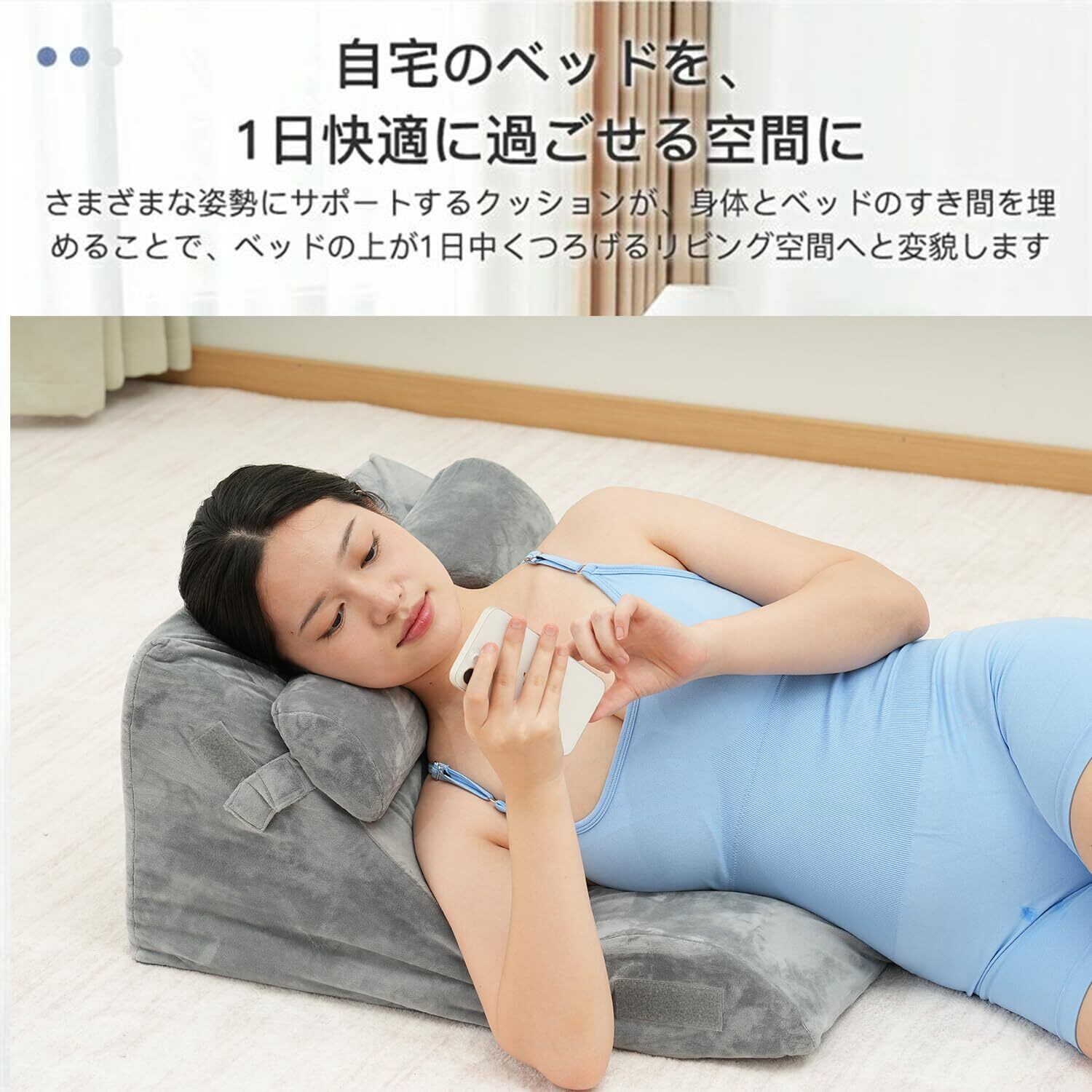 【多機能読書クッション】壁、ベッド、ソファにもたれて、本を読んだっり、テレビを見たり。ごろっと横になったり、うつ伏せしたりしてスマホを見ても丁度良い角度です。妊婦さんは仰向けで寝るのが大変なので、このクッションを使ってちょっと横になりたい時にとても便利です。リラックス時に、足を上げてむくみを解消する足枕も使えます。