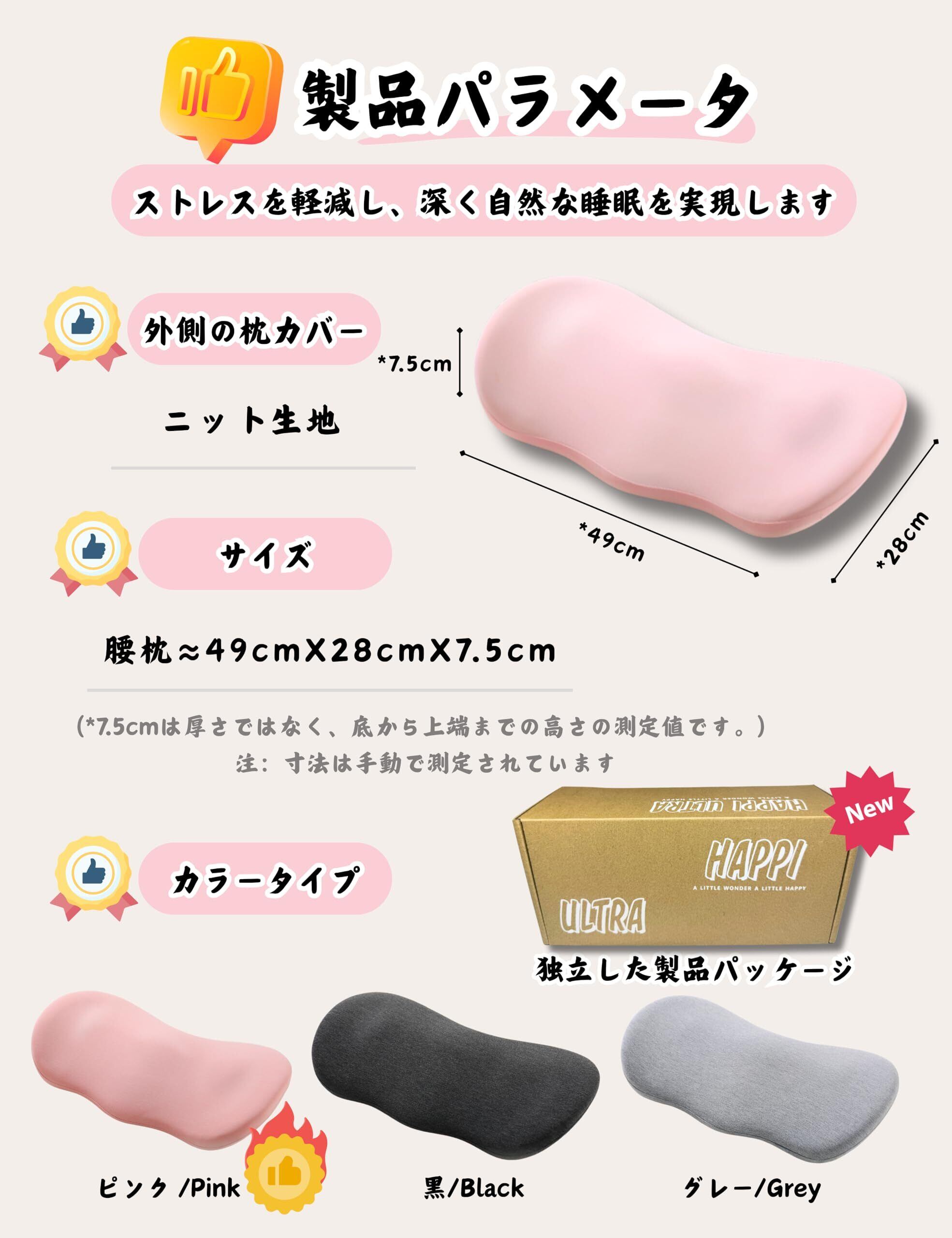 【枕面サイズをアップグレード】睡眠時に仰向けや横向きで寝る状況を考慮して、約49cm×28cm×7.5cm(7.5cmは厚さではなく、底から上端までの高さの測定値です)腰枕の表面の湾曲により、厚さは約4〜5cm。ですのサイズに設計されています。また、4つのエリアに分かれているので、より継続的に腰を伸ばし、腰痛を和らげます。快適な睡眠高さを提供し、正しい腰の姿勢を維持します。足枕としても使用でき、膝や足を乗せることで足にかかる圧力を軽減し、安らかに眠ることができます。