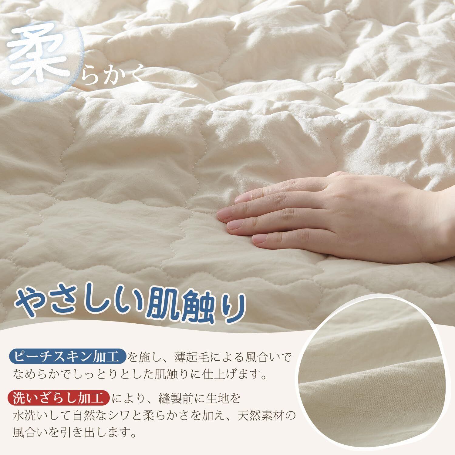 「洗いざらし&超柔らか肌触り」:「洗いざらし」とは、何度も洗って風合いが自然になった状態を指します。お使いいただく初めから自然な風合いや、やわらかな肌触りを楽しめるように、「洗い加工」を施しています。この加工を施した寝具は、洗濯や使用するごとにさらに柔らかくなり、肌になじみやすくなります。
