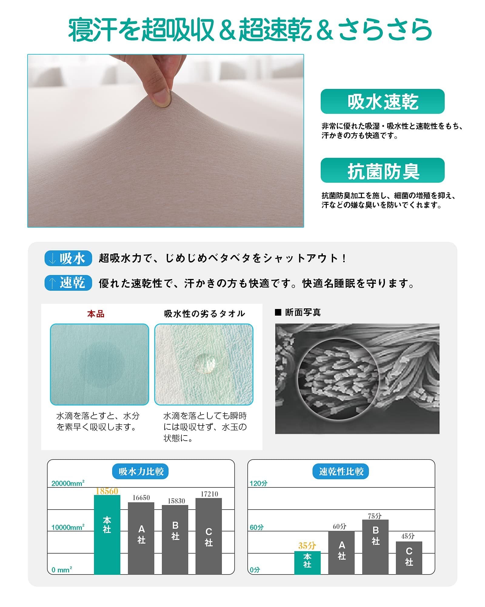 【超吸水速乾】:優れた吸湿性と通気性で、汗でもベタつかないサラサラ感を保ちます。ムレにくく、1年中快適にお休みいただけます。汚れ防止だけでなく、肌への優しさ、快眠のために機能する快眠シーツです。【ご自宅で丸洗い可能】:洗濯耐久性に自信あり!ご自宅の洗濯機で丸洗い可能、いつでも清潔に使えます。洗い替え用2枚以上のご購入をお勧めします。