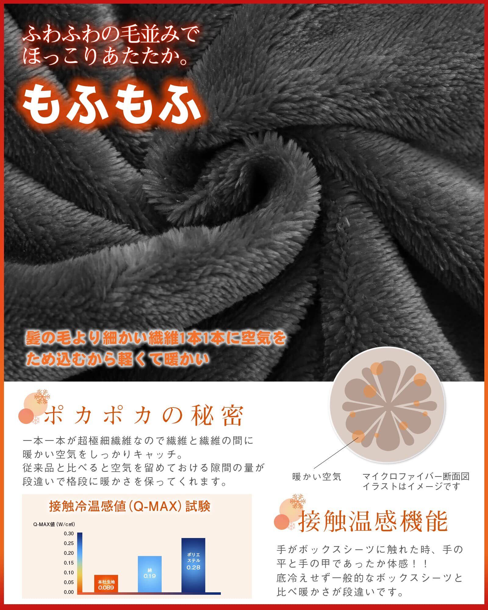 【保温性能をアップグレード&あったか接触温感機能で布団に入って即あったか!】従来品のボックスシーツを改良し、特殊な技術の蓄熱マイクロファイバー素材を使用しています。①ボックスシーツ生地は人体が放出するエネルギーを吸収し、布団内部の温度を上げ、熱を蓄えます。②従来品のボックスシーツ生地よりも長い極細繊維パイルで、繊維と繊維の間に空気をため込み、体温を逃さず暖かさを保ちます。③新機能の接触温感で、ボックスシーツに触れた時、手の平であったか体感!!このボックスシーツを敷くだけで、布団にはいった瞬間からふわふわの暖かさを感じられます。通常の暖かいシーツより高い保温力を期待できます。
