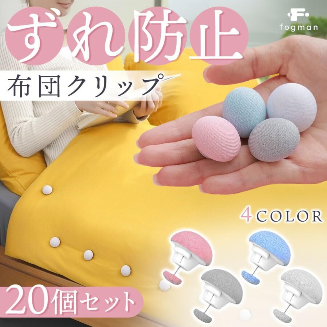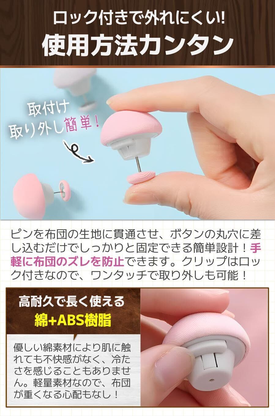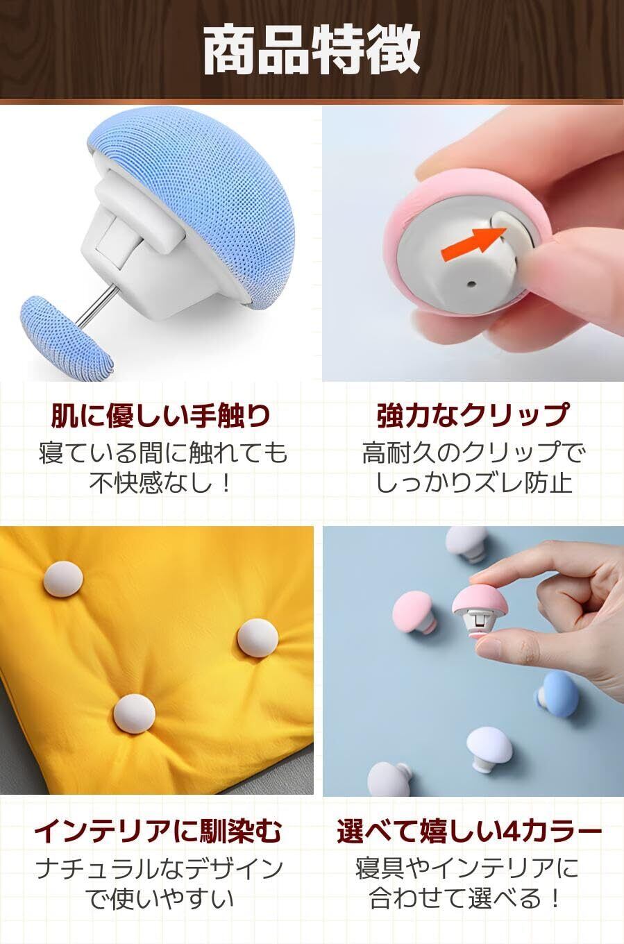 【商品特徴】①肌に優しい手触り:寝ている間に触れても不快感なし!/②強力なクリップ:高耐久のクリップでしっかりズレ防止/③インテリアに馴染む:ナチュラルなデザインで使いやすい/④選べて嬉しい4カラー:寝具やインテリアに合わせて選べる!