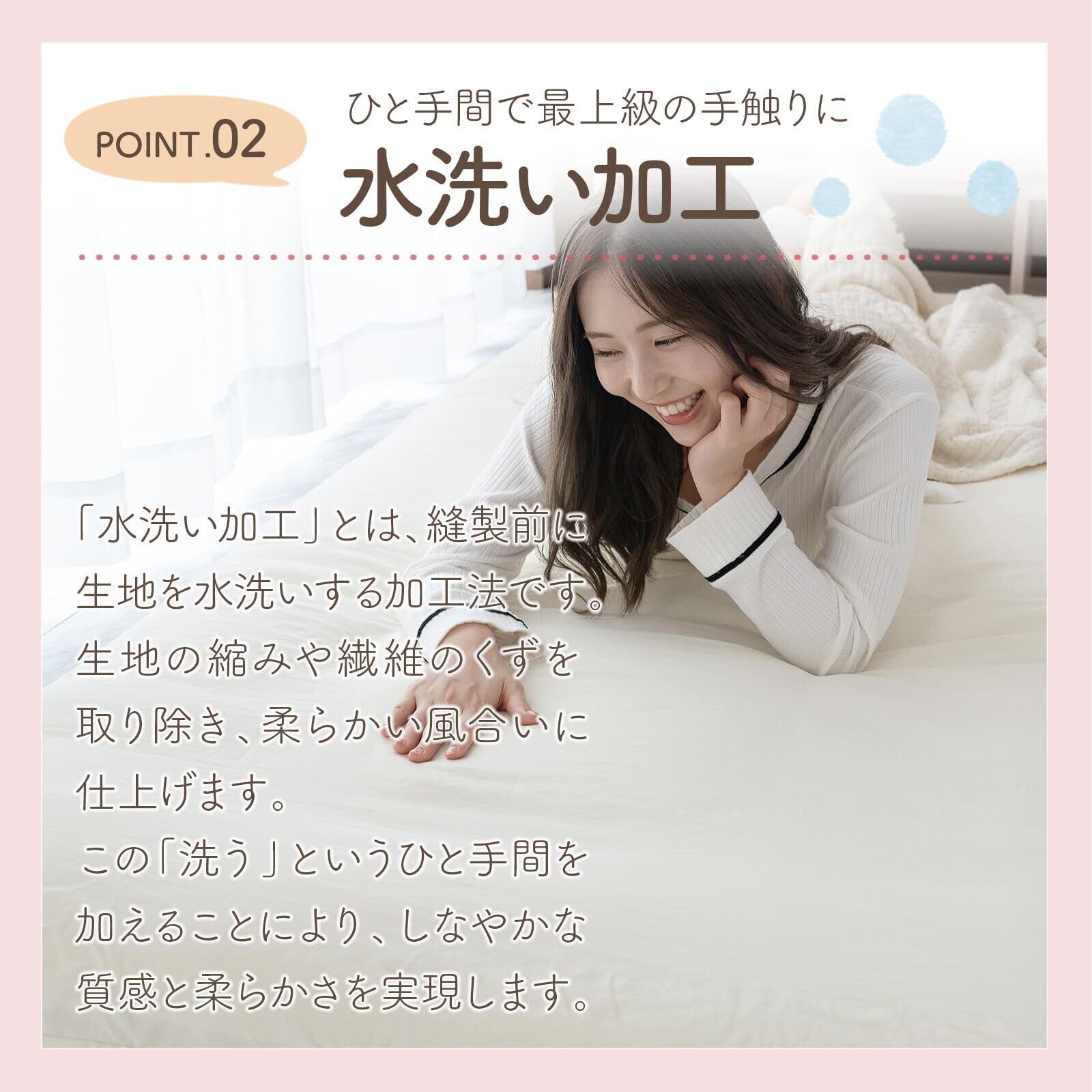 【シルフィーズで一番柔らかいシーツです】思わずほおずりしたくなる柔らかさ、他のシーツでは体感できない柔らかさを追求しました。その秘密は洗いざらし加工。水洗い加工をすることで生地が約20%ほど縮み、ふんわり感がアップするんです。