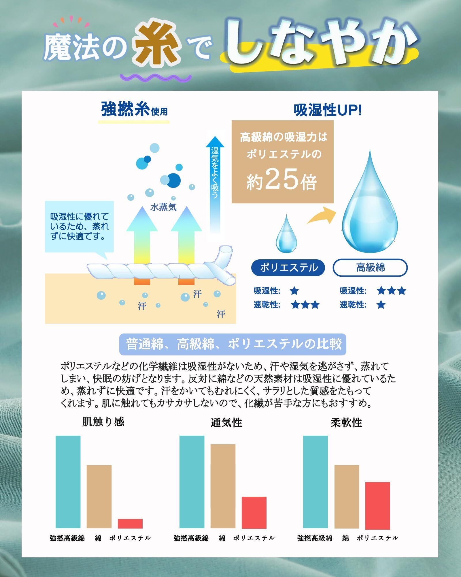 【速乾性・通気性天然】厳選された上質なコーマ糸を使用し、特殊な強撚技術で糸を緻密に編み込んでいます。毛羽立ちを最小限に抑え、心地よい肌触りを実現しました。の枕カバーの熱伝導率(Qmax値)は0.33。通常の綿の2.5倍という高性能で、速乾性と通気性も数倍に上げます。寝汗をしっかり吸収し、快眠へ!朝まで心地よい温度をキープします。
