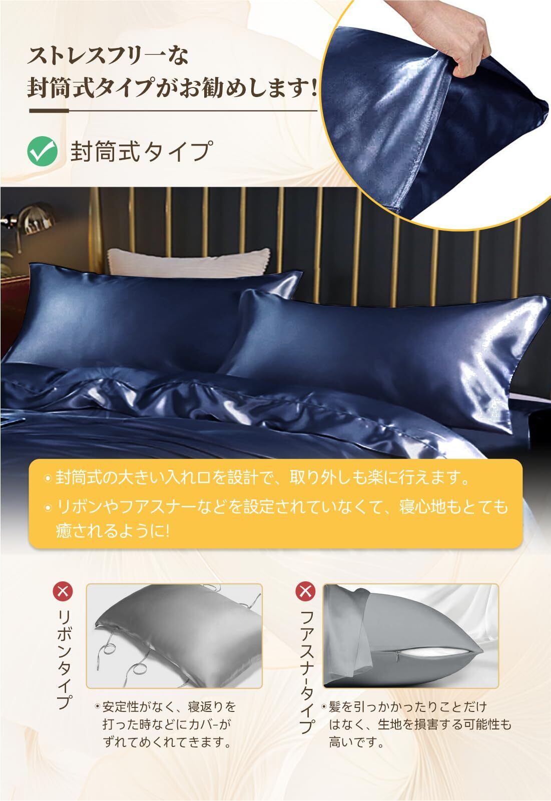枕カバー 贅沢 両面サテン すべすべ まくらカバー 封筒式 ピローケース 洗える 寝癖軽減 抗菌防臭 美髪 うるつや髪 敏感肌に優しい おしゃれ ギフト 贈り物 四季適応 サラサラ プレゼント最適【ネイビー 63*43cm 2枚】枕カバー