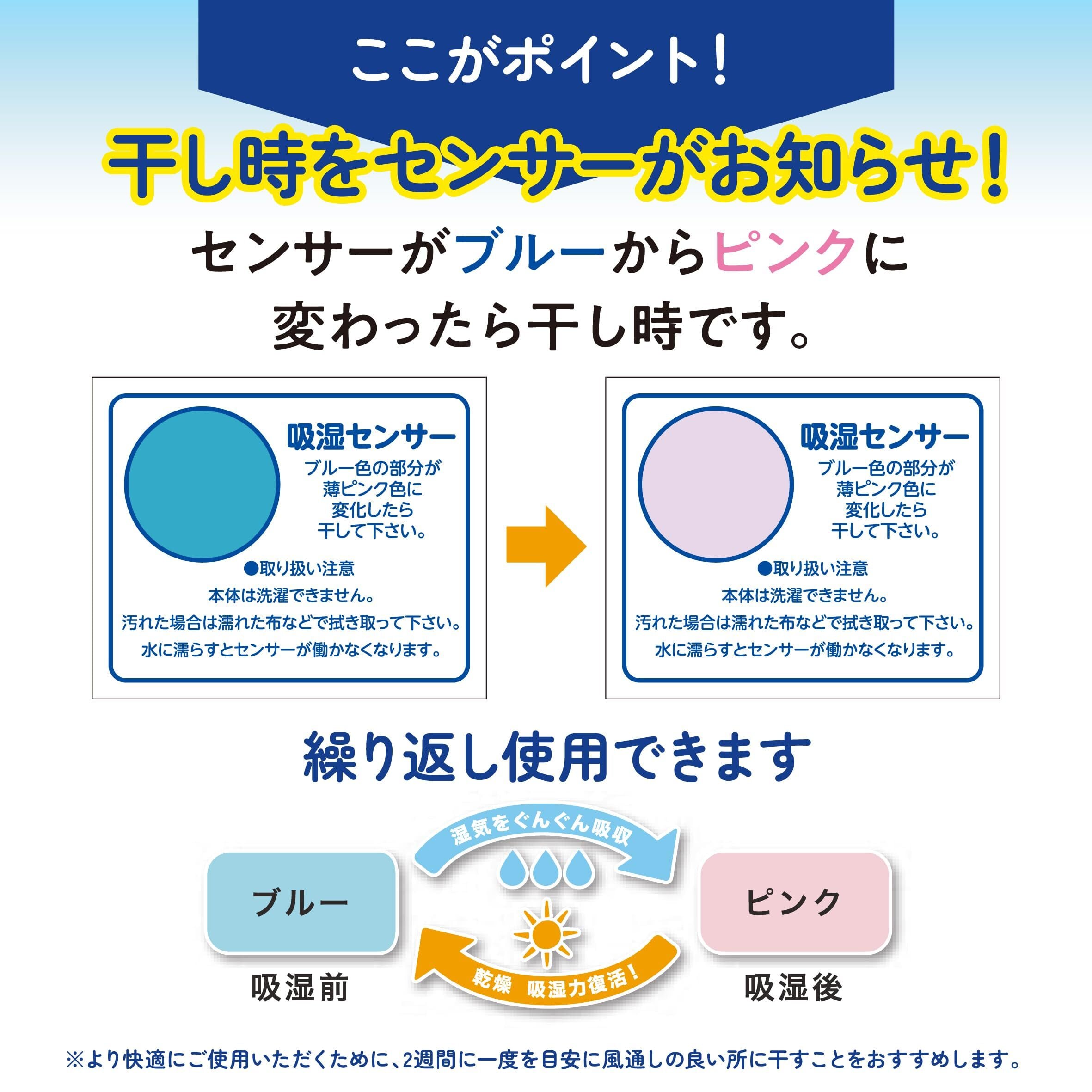 干すことで繰り返し使えます。湿気を吸収したら色が変わるセンサーシート付なので干し時を逃しません。