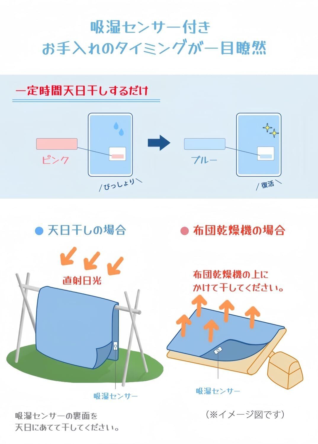【干すタイミングが分かるセンサー】吸湿センサー付きでお手入れ簡単、センサーの色がブルーからピンクに変わったら、天日に干すか、布団乾燥機にかけて下さい。色がブルーに戻ったら繰り返しご使用頂けます。乾燥を繰り返せば何度でもご使用になれます。お布団へのダメージも軽減してくれて経済的です!