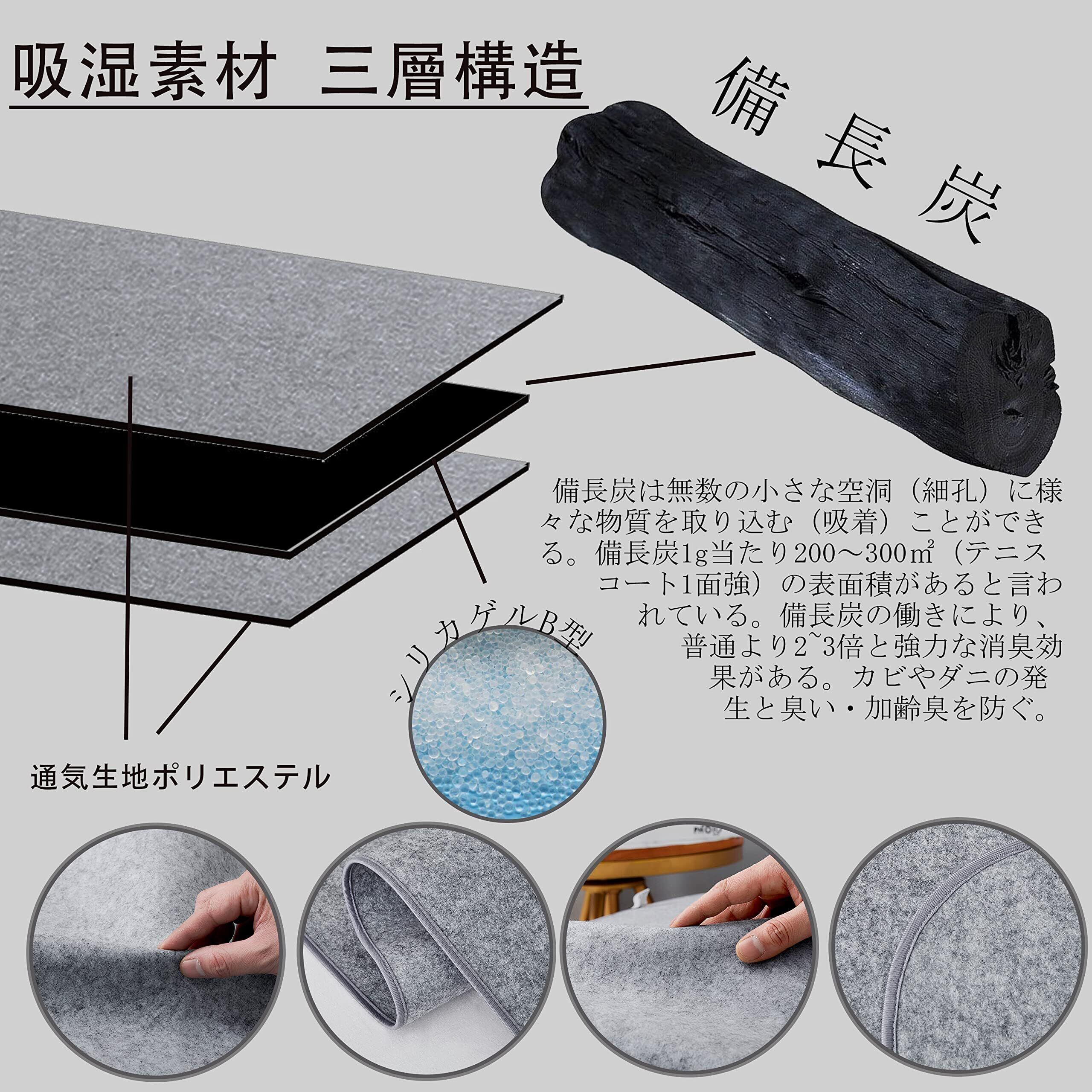 「吸湿性抜群・消臭抗菌」:備長炭、シリカゲルB型で作られた吸湿力抜群の除湿シートで快適に眠ることができます。湿気の多い梅雨、寝汗のかきやすい夏、結露が出やすい冬の、年間通した湿気対策が可能です。また、防ダニ・カビ加工付き。お肌の弱い方でもお使いいただけます。