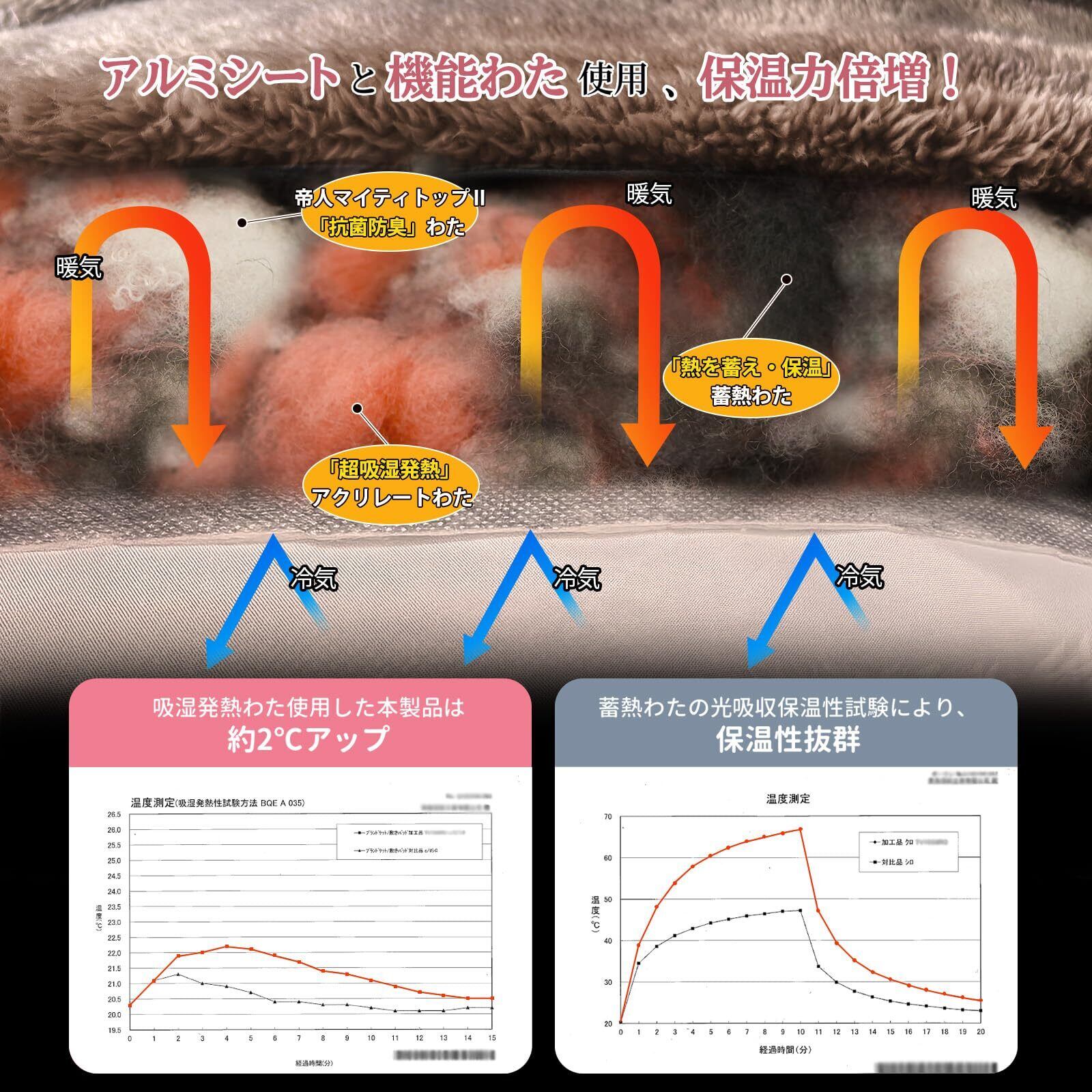 【こだわり多重保温】①「接触温感Q-MAX0.08」8mm ロングパイルマイクロファイバー②「吸湿発熱・保温蓄熱」アクリレートわた+TEIJIN抗菌防臭わた ③「熱を蓄え・保温」蓄熱わた④「冷気遮断」アルミシート ⑤「爽やか・耐久性」裏地リサイクルピーチ。寝ている間に、発熱・保温・断熱が繰り返されるため、寒い冬でも暖かさをキープできるしきぱっとです。