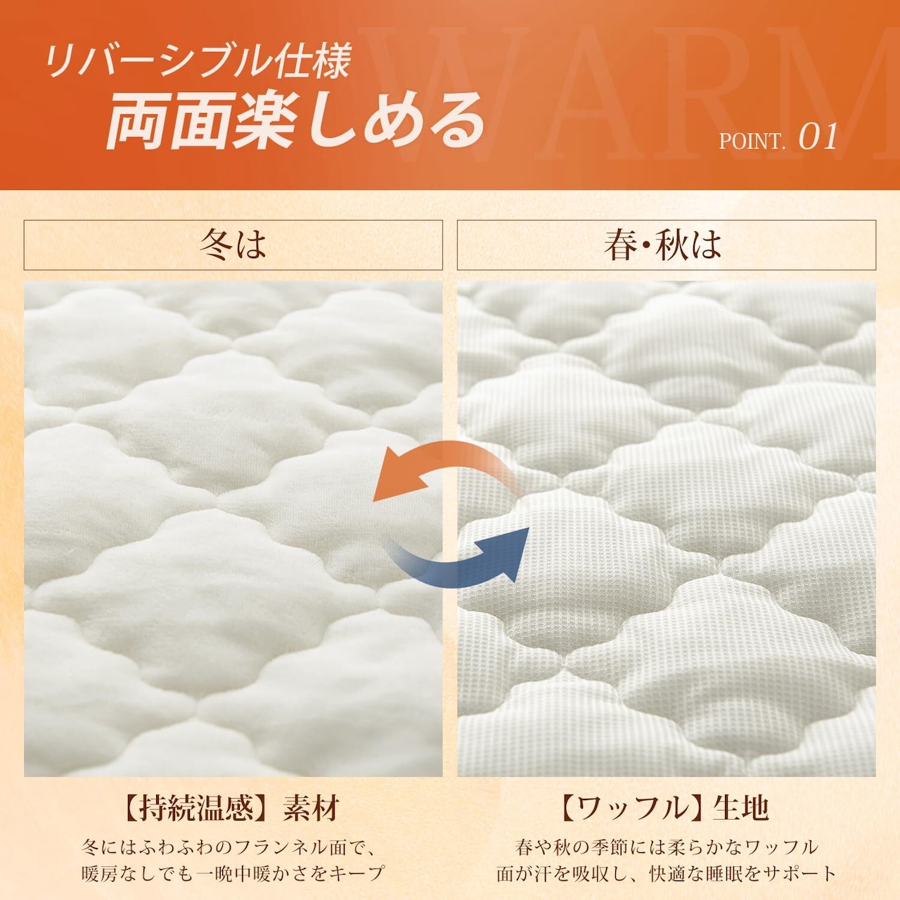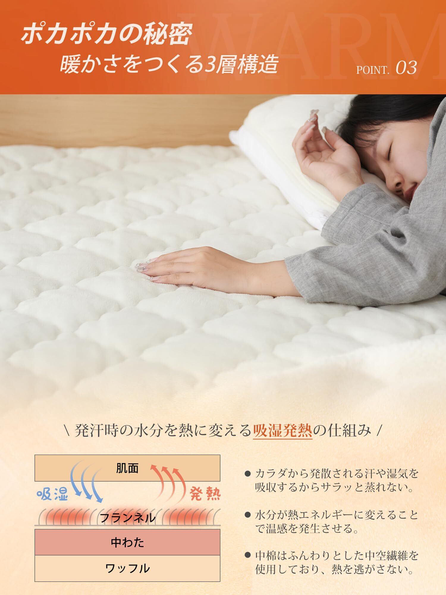 「持続温感敷きパッド」フランネル面は柔らかく、厳冬でも布団に入る瞬間にヒヤッとしません。マイクロファイバーを使用しているため、細かい繊維の間に空気を取り込み、暖かい空気を逃がさずに保ちます。さらに、蓄熱中ワタは体から発生する湿気を熱に変え、持続的な暖かさを実現します。