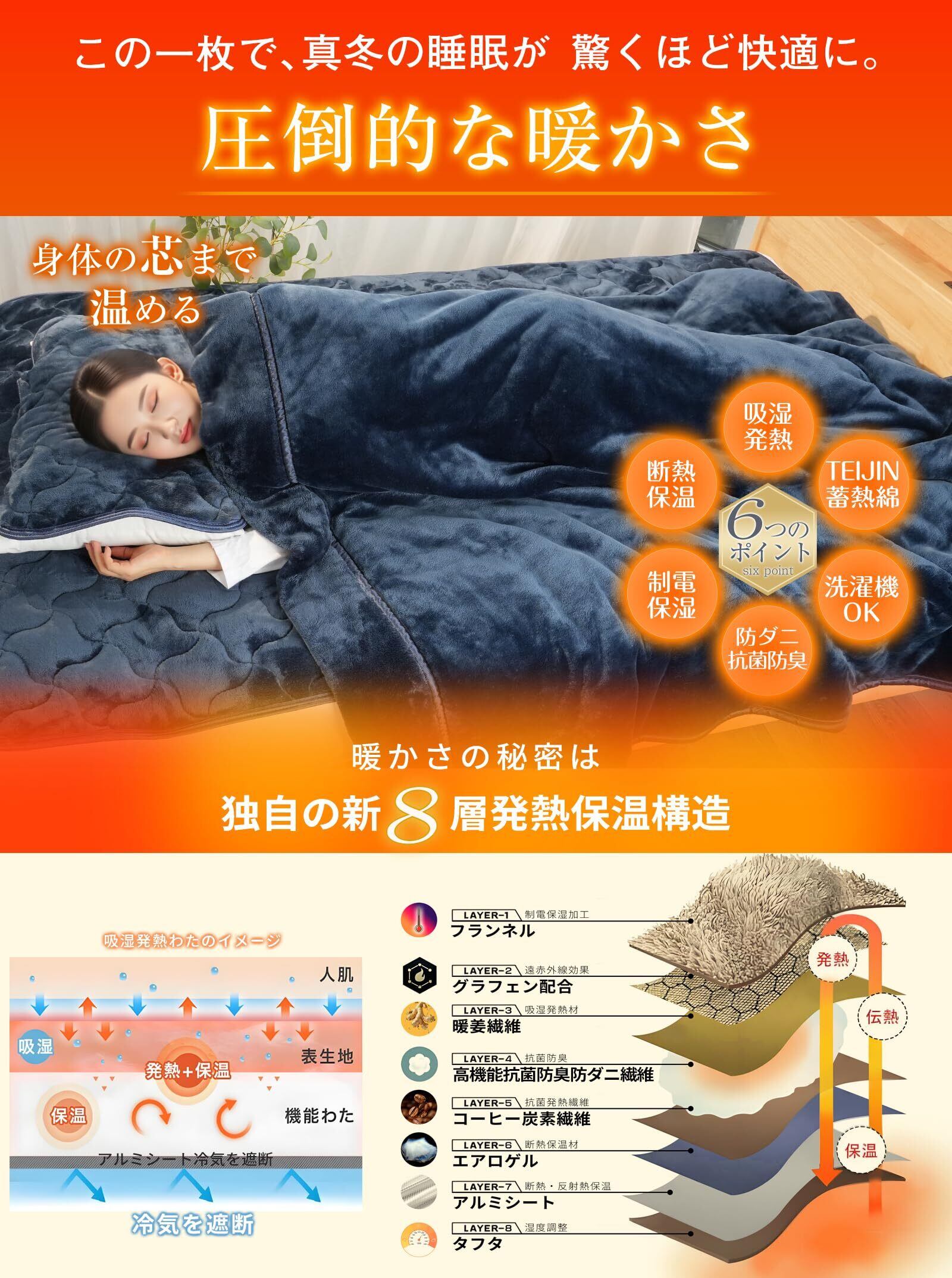 【一晩中持続する暖かさの秘密】は、こだわりぬいた独自の「新8層発熱保温断熱構造」です。①このあったか敷きパッドの表層には、驚くほどなめらかな肌触りのマイクロファイバーを使用、ふわっと素肌に触れるたびに、極上の気持ちよさにとろけてしまうほど。②生地基布に「遠赤外発熱」「熱伝導性」「蓄熱保温」「抗菌防臭」特性を備えている奇跡のグラフェン配合しています。③『贅沢に詰め込んだのは、特別な中わた』中わたの上層には、天然生姜成分配合の吸湿発熱新素材『暖姜繊維』と高機能抗菌防臭防ダニ繊維を採用しています。下層には「吸湿発熱」「蓄熱保温」「遠赤外発熱」「消臭」の特性を持ち、環境にも優しい素材『コーヒー炭素繊維』と次世代断熱材『エアロゲル』を採用。「吸湿発熱」×「遠赤外発熱」のわたが、寝ている間の汗を吸って暖かさに変え、しかもムレにくくなっているので、より保温性が高くなっています。④裏地には「冷気遮断」のアルミシートを使用し、敷パッドの下層部でつくられた熱を反射させ、外部からの冷気を遮断。圧倒的な暖かさを効率よく全体に伝えて循環させるから、真冬でも暖かさが保てます。