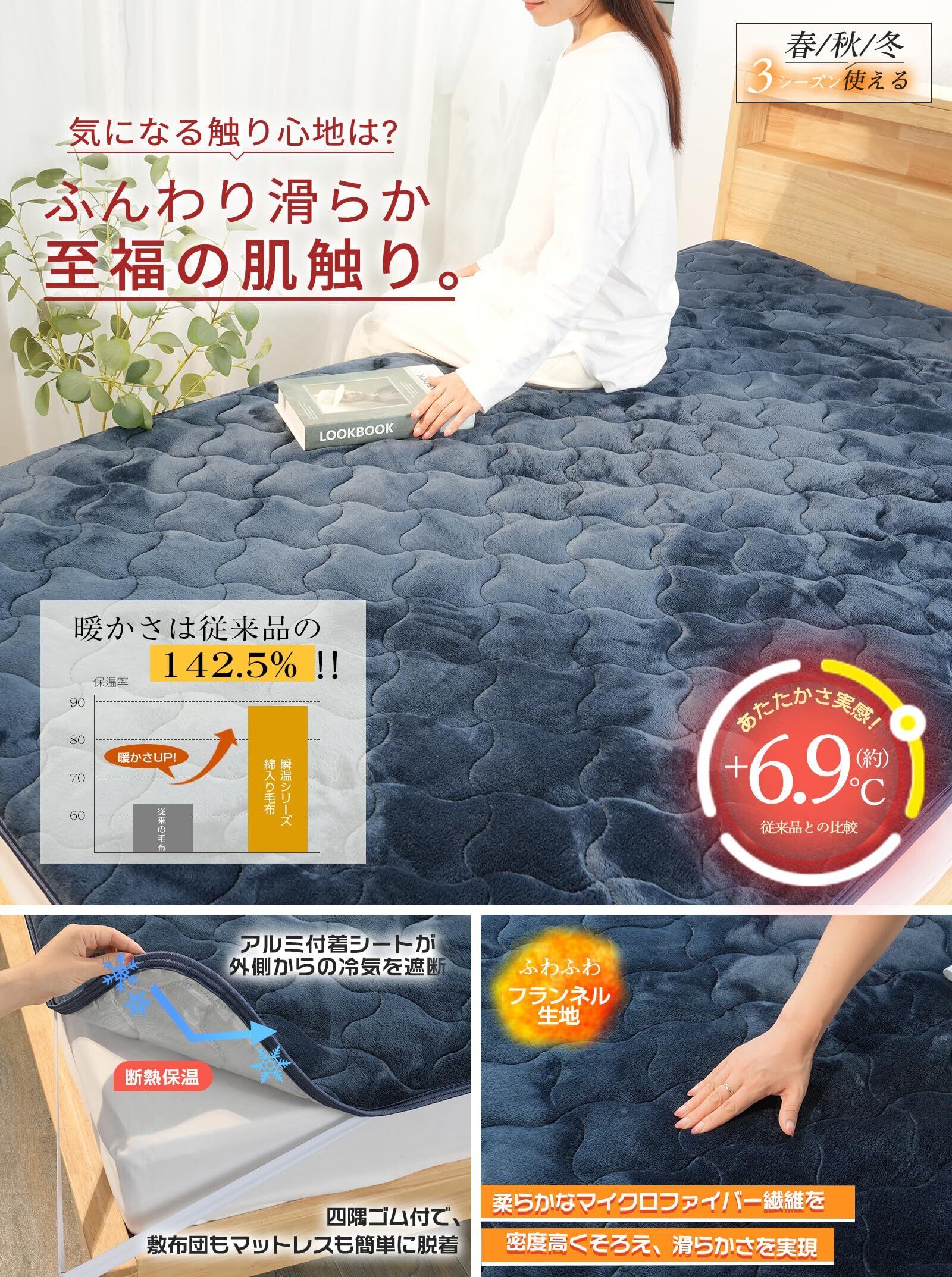 『敷きパッド セミダブル 冬用』冬用あったか敷きパッドの素材:ポリエステル 【特徴】: 4つの最先端テクノロジーを使用して、軽くても暖かい敷パッドです。四隅に強化ゴムバンドが付いているため、簡単に着脱。敷布団でもマットレスでもお使いいただけます。【丸洗いOKでいつでも清潔!】洗濯ネットに入れて、ご自宅の洗濯機で簡単に丸洗いできので、いつでも清潔。ホコリやニオイが気になる方にも安心してお使いいただけます。