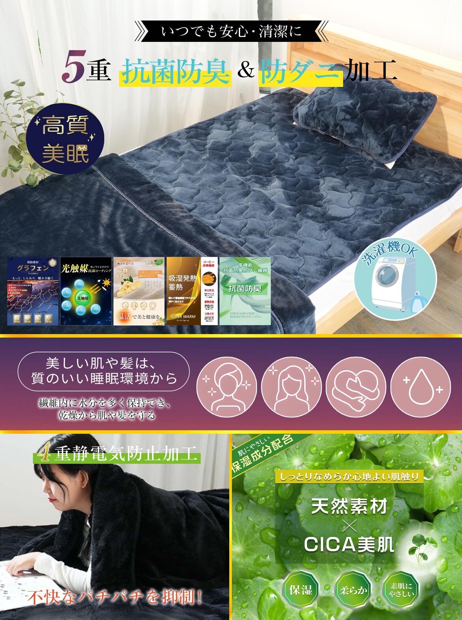 【4重静電気防止×CICA保湿加工で『高質美眠』を実現!】①表生地には導電性繊維が混合されており、静電気によるパチパチ感を軽減させ、ホコリや花粉等が付きにくくなっています。②生地基布に優れた電気伝導性も備えているグラフェン素材を採用。グラフェンを配合した生地は最高レベルの静電気防止性能を実現できます。③放電を促す帯電防止剤を塗布することで、あったか起毛素材に起こりがちなパチパチ感を抑制。④韓国美容でも話題の、肌荒れを防ぐ「天然由来の保湿成分」CICA(ツボクサエキス)を配合することで、繊維内に水分を多く保持でき、保湿効果を高めています。睡眠時の摩擦や乾燥から肌や髪を守り、お肌のケアと良質の睡眠を同時にかなえることができます。洗濯を繰り返しても効果は持続。