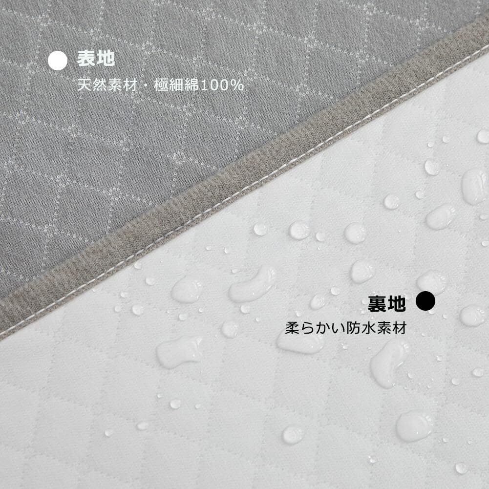 <防水機能>裏面には防水素材が使用されており、水や液体が浸透しないように加工されています。この素材は、下に敷いたシーツやマットレスを守ることができます。しっかりと防水をしますが、通気性が良く、夏にも蒸れずに快適に使用できます。また、防汚性にも優れており、汚れがつきにくく、手入れも簡単です。このため、ベビーや小さな子供のおむつ替えや介護などにも広く利用されています。防水素材は柔らかく、普通の防水シーツのようなカサカサした音が発生しなく、毎日静かに眠れます。