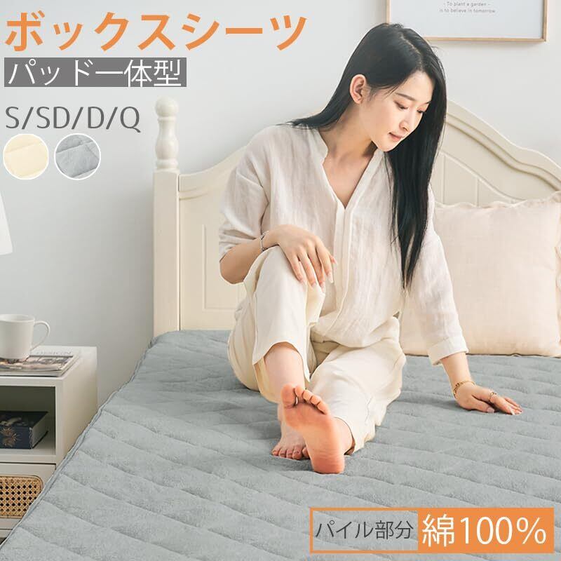 シングルサイズ(100×200cm)のこのパッド一体型ボックスシーツは、オールシーズン対応で、いつでも快適な睡眠環境を提供します。パイル部分は綿100%で、優しい肌ざわりが特徴です。タオル地の質感が、リラックスした時間をもたらします。