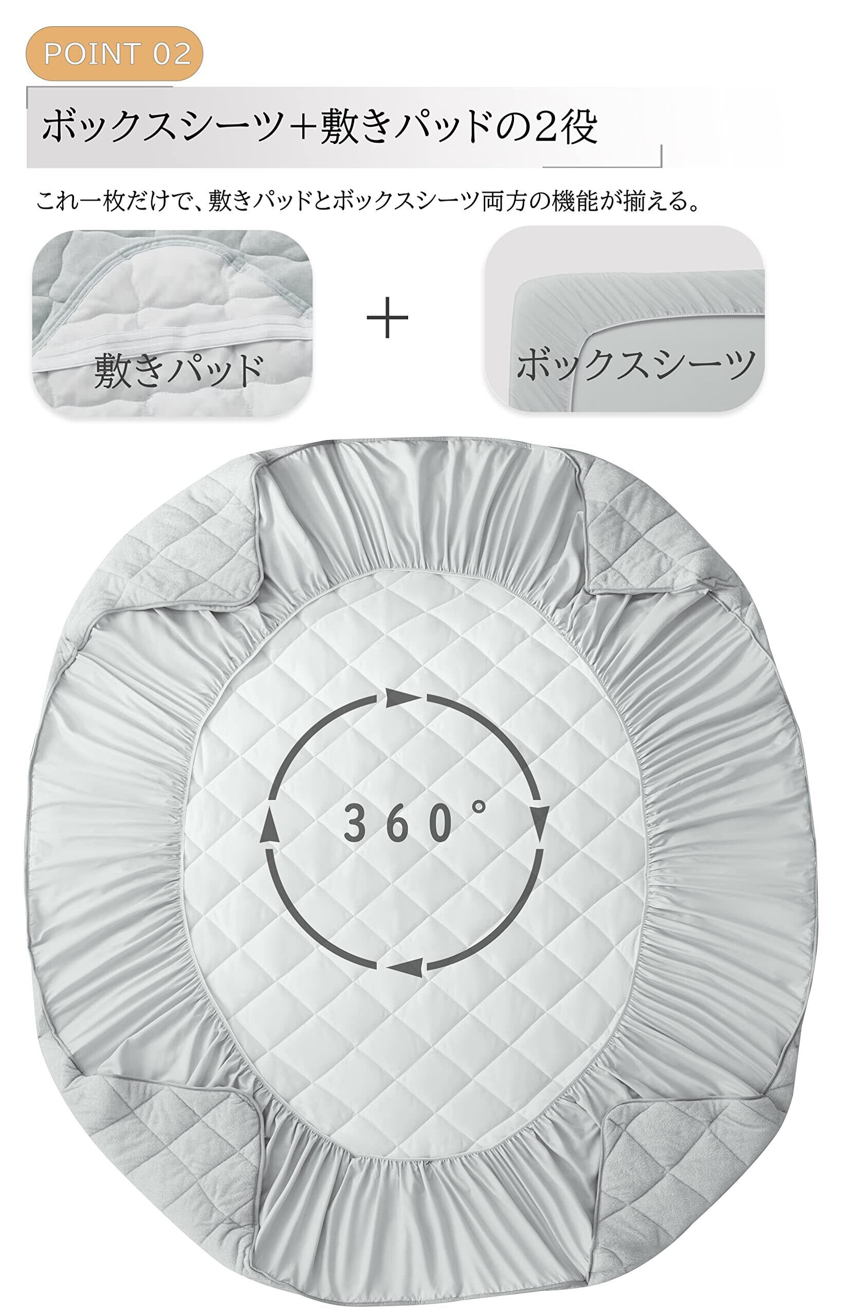 【ボックスシーツ+敷きパッド 一体型】:ほどよい厚みの中綿を入れ、ふんわり心地よい寝心地を実現しました。一体型なので敷パッドの取り付け用ゴムが表に出ることもなく見た目もキレイ!全周フィットゴム付きで取り付けも簡単です。ベッド用、マットレス用、敷ふとんなどにも使えます。