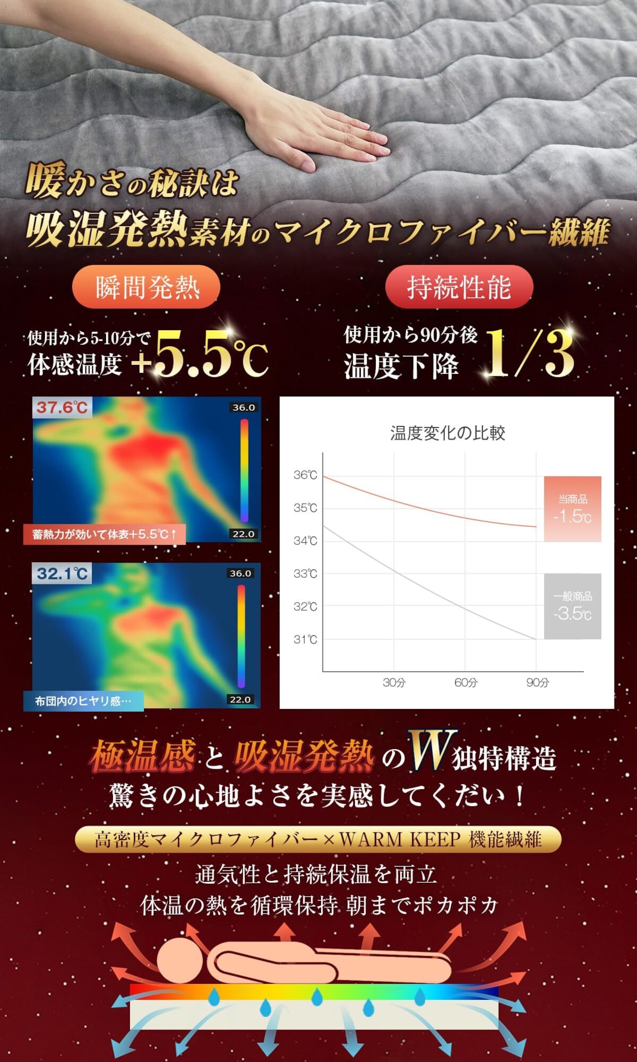 本商品は、接触温感と吸湿発熱機能を兼ね備えており、寝るときに体温を蓄えて温かさを持続。寒い夜でも心地よく眠れる環境を作り出します。肌触りも柔らかく、まるで雲の上で眠るような贅沢な感触です。