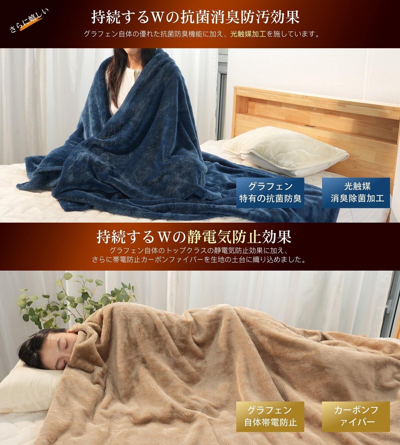 【毎日使いたくなるやさしさにこだわった軽量毛布】グラフェンは様々な機能性を持ち合わせた「奇跡の素材」と言われています。トップクラスの帯電防止機能と、高耐久性、抗菌防臭機能など。いずれも素材自体がもつ機能なので、洗濯しても効果が変わりません。さらに、光触媒の抗菌防臭防汚加工を施し、生地の土台に帯電防止カーボンファイバーを織り込めました。ダブルの抗菌防臭防ダニ効果と静電気防止効果で、小さいお子様や犬などペットがいる家庭でも、家族みんなでいつも安心して清潔にお使いいただけます。